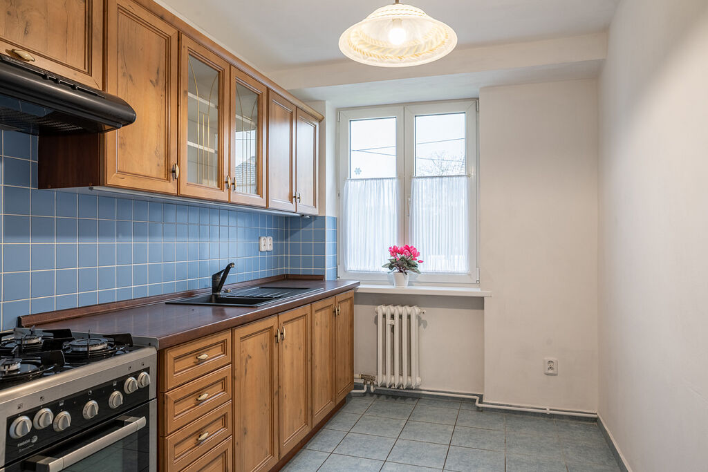 Uvnitř vás přivítají tři neprůchozí pokoje a světlá kuchyně, kam se pohodlně vejde i rodinný stůl.
