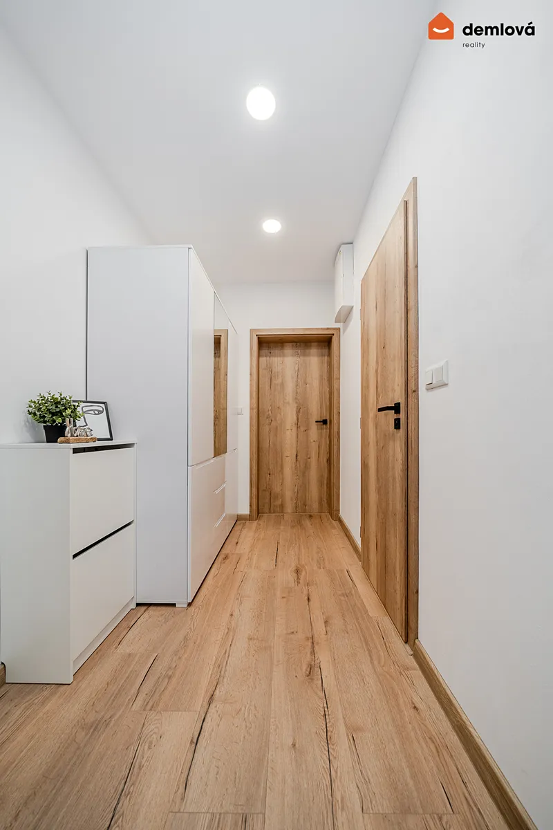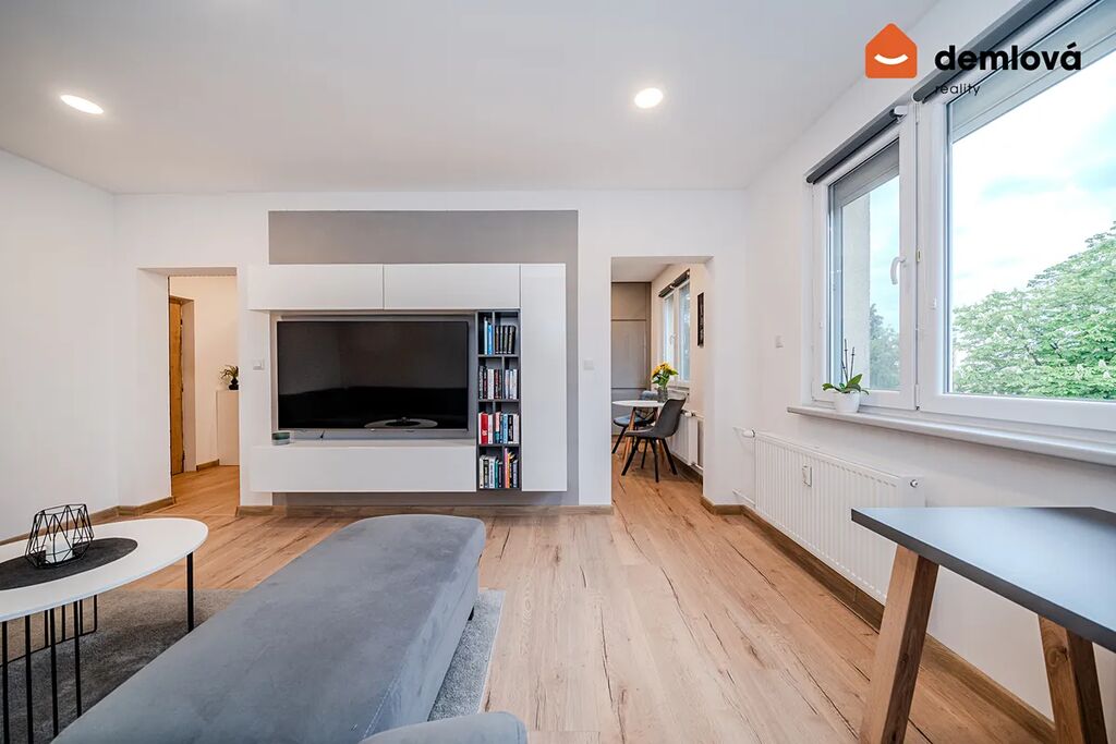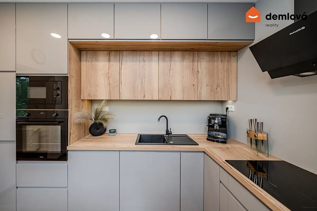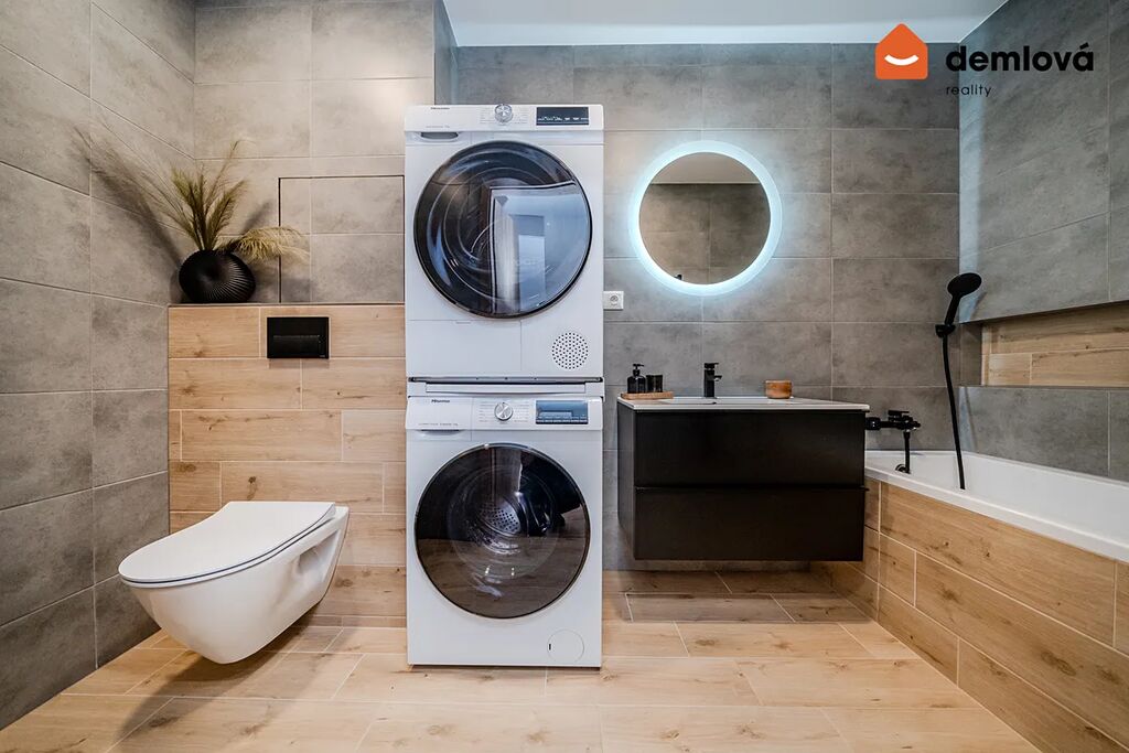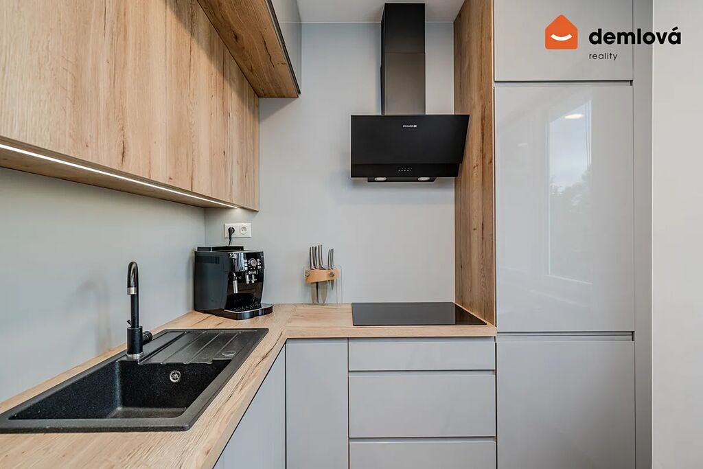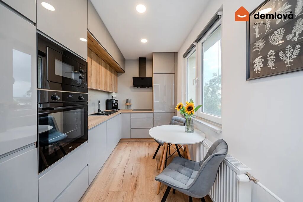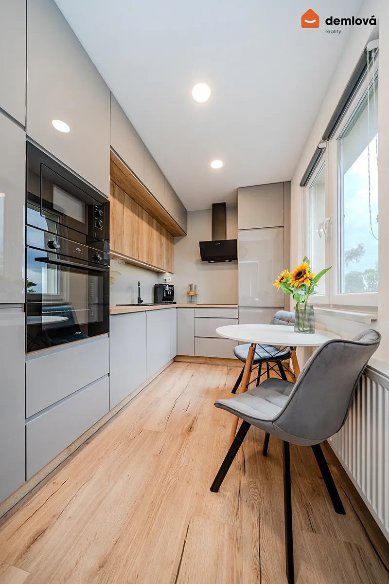 Kuchyňská linka ve vysokém lesku a moderním designu je vybavena spotřebiči včetně myčky, multifunkční trouby, indukční varné desky, digestoře, mikrovlnné trouby a lednice s mrazákem. Koupelna v elegantním provedení s vanou, umyvadlem se stylovou skříňkou a závěsnou toaletou. V celém bytě jsou nové interiérové dveře včetně zárubní, podlahy mají nivelaci a kvalitní plovoucí podlahu s V-spárou. Neprůchozí pokoje nabízejí dostatek prostoru a soukromí. Z bytu je příjemný výhled na jihozápadní stranu.