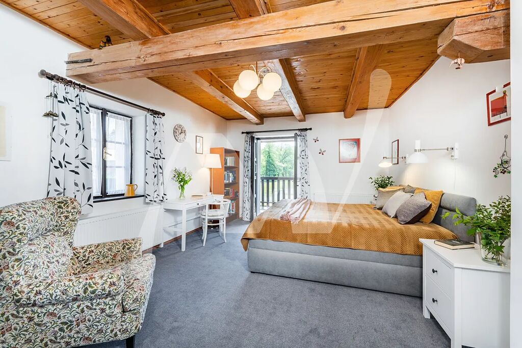 Pátou ložnici a koupelnu najdete v podkroví. Velká část podkroví s viditelnými dřevěnými trámy nabízí možnost případné další vestavby či rozšíření domu.