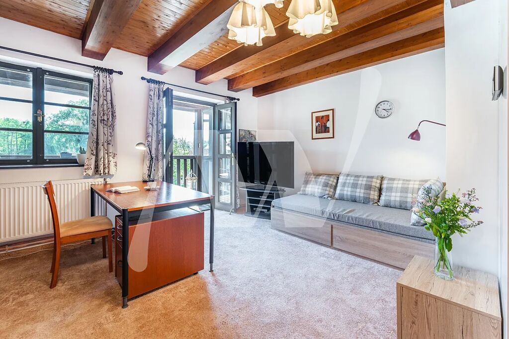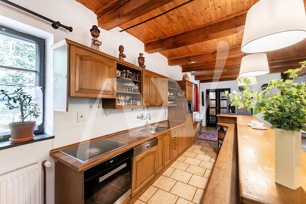 Dům disponuje velkorysým obývacím prostorem s kuchyní a barovým pultem, stylovými kachlovými kamny, kulečníkovým stolem a útulnou televizní místností. Navazující velká slunná z části zastřešená terasa je orientována do zahrady s výhledem na rybník a zeleň.