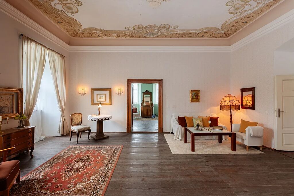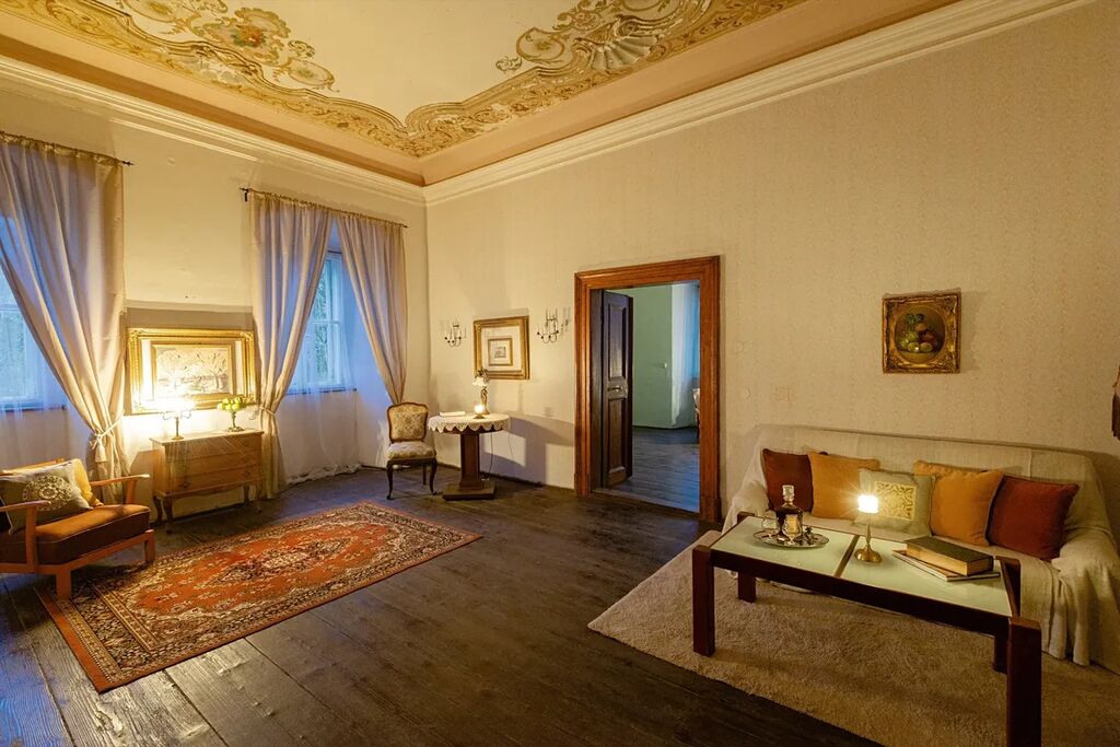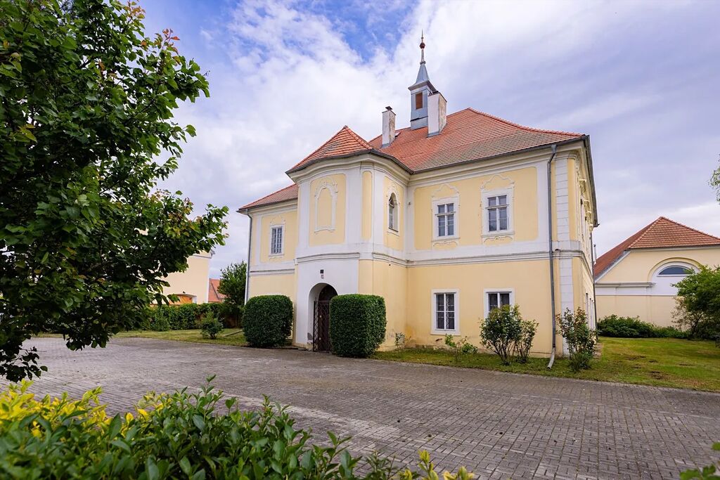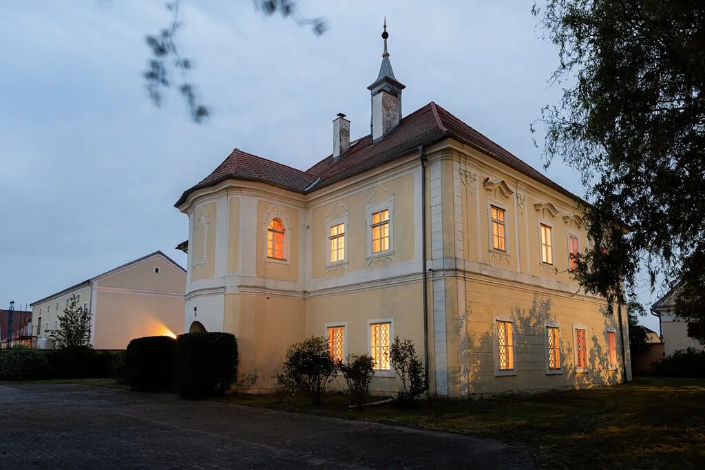 Dvoupodlažní stavbu s původní zámeckou kaplí tvoří obdélníkový půdorys o dvou podlažích. Celkem 13 místností, které jsou v obou podlažích přístupné přes centrálně umístěnou chodbu. V prvním podlaží lze pozorovat klenuté stropy, nahoře potom zdobené stropy o výšce 3,8 metru. Opravdovým klenotem je pak zcela původní kaple Čtrnácti svatých pomocníků, která je umístěna v průčelí druhého podlaží vedle hlavních komnat.