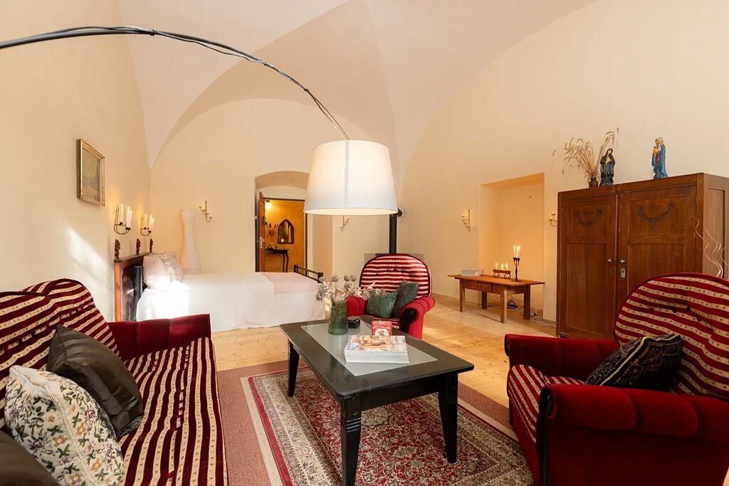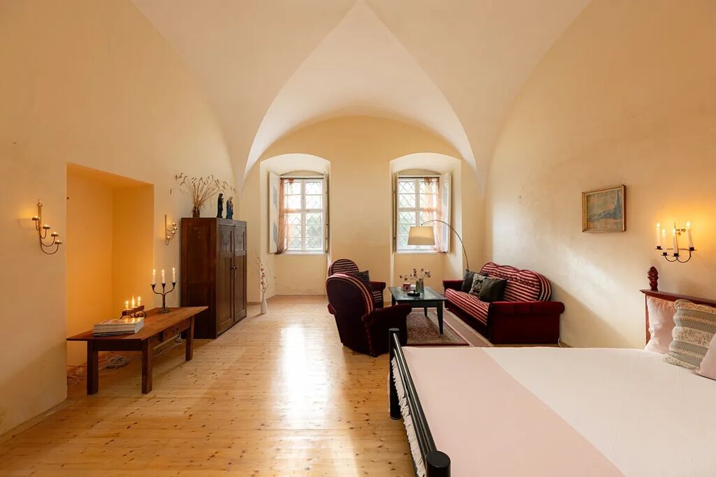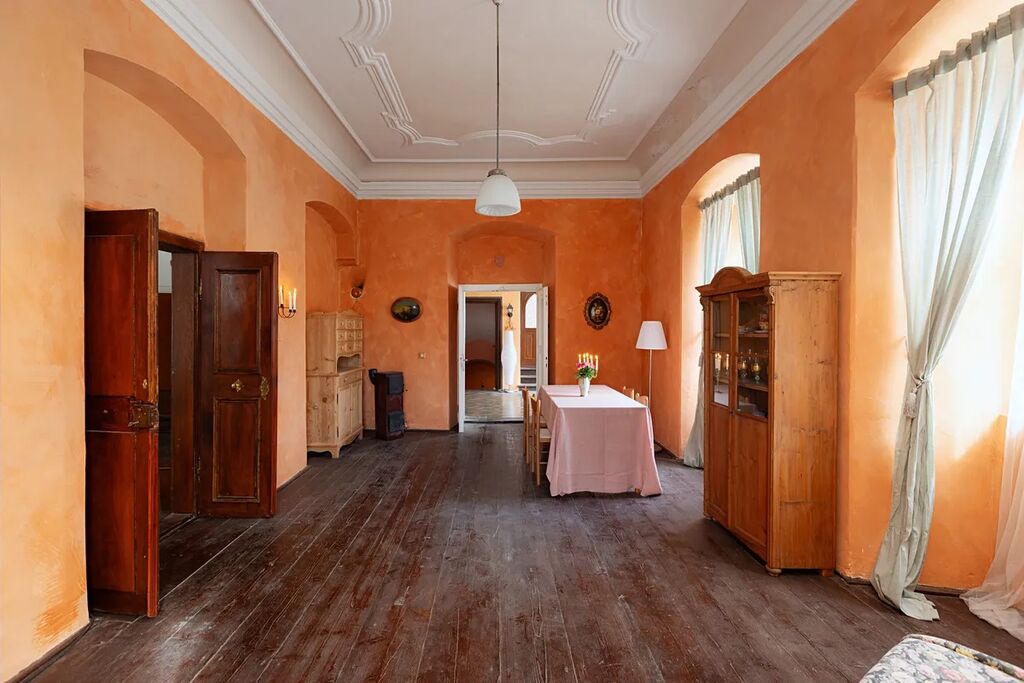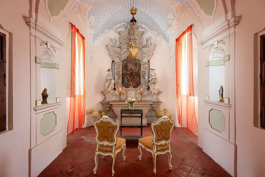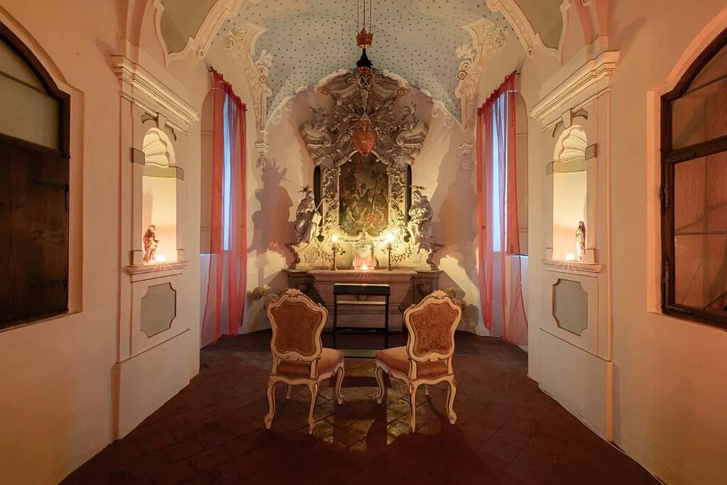 Dvoupodlažní stavbu s původní zámeckou kaplí tvoří obdélníkový půdorys o dvou podlažích. Celkem 13 místností, které jsou v obou podlažích přístupné přes centrálně umístěnou chodbu. V prvním podlaží lze pozorovat klenuté stropy, nahoře potom zdobené stropy o výšce 3,8 metru. Opravdovým klenotem je pak zcela původní kaple Čtrnácti svatých pomocníků, která je umístěna v průčelí druhého podlaží vedle hlavních komnat.