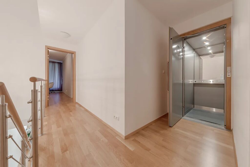 Výjimečný moderní mezonetový byt o dispozici 6+kk s vlastním výtahem, terasou, předzahrádkou, garáží, sklepem a zajímavým prostorem v podzemním patře.