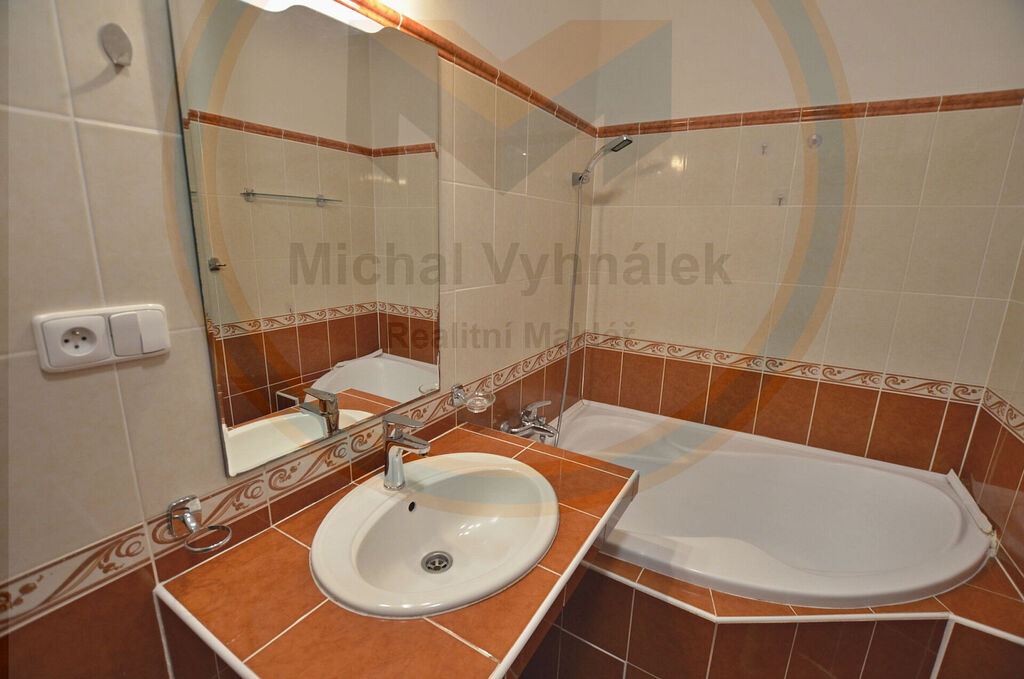 Samostatná koupelna s vanou, elektrickým bojlerem, umyvadlem a WC.