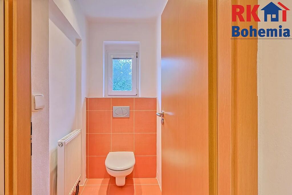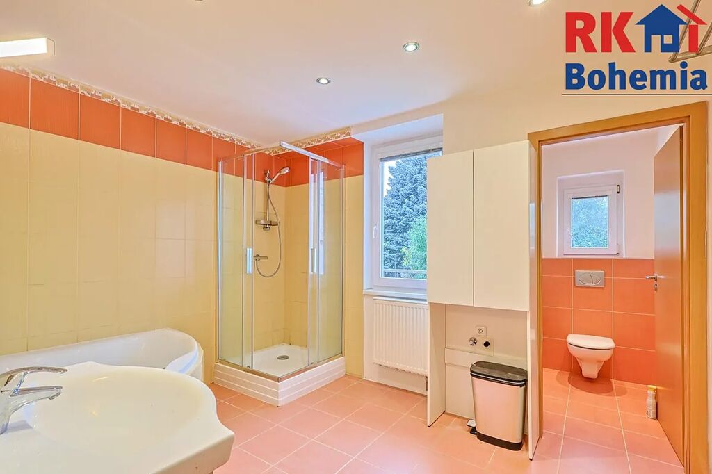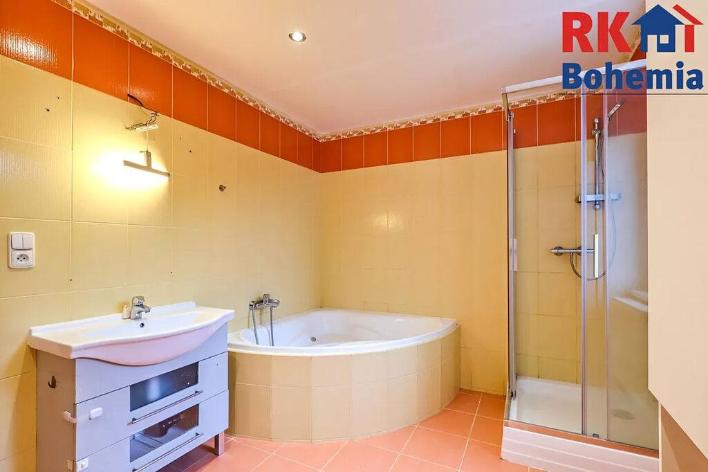 V koupelně se nachází rohová vana, sprchový kout a umyvadlo s umyvadlovou skříňkou. WC je přístupné přímo z koupelny.