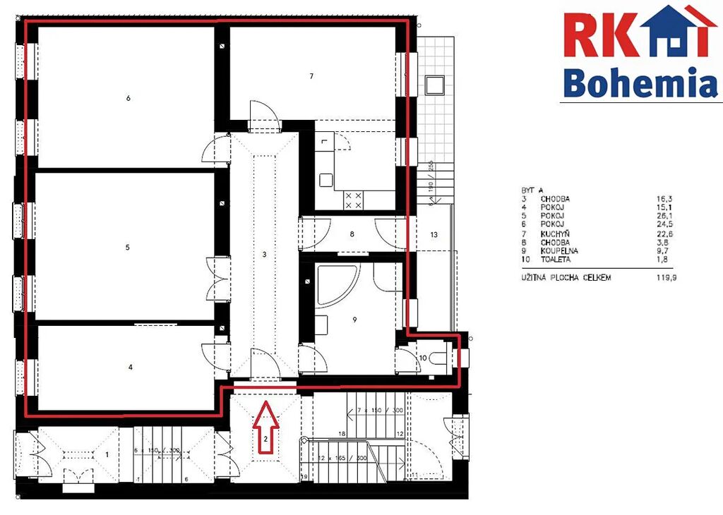 Byt se skládá z kuchyně (22,6 m2), 3 pokojů (15,1 m2, 26,1 m2, 24,5 m2), koupelny (9,7 m2), WC (1,8 m2) a 2 chodeb (16,3 m2 a 3,8 m2). Celková užitná plocha bytu je 119,9 m2. K bytu náleží terasa (11,1 m2), která je přístupná z chodby bytu.