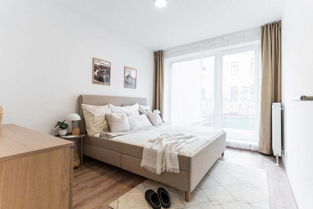 Abychom budoucím obyvatelům tohoto bytu ušetřili vynaložené úsilí při stěhování, vybavili jsme ho kuchyňskou linkou a pračkou se sušičkou. A nejedná se o nejlevnější kousky :) Nemalým bonusem je pak vybavení koupelny v podobě šuplat pod umyvadlem a zrcadlové skříňky, dále pak částečné vybavení předsíně a zatemňovací závěsy.