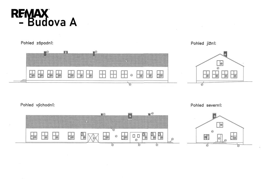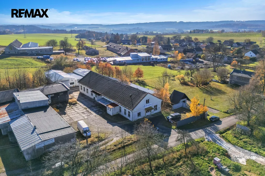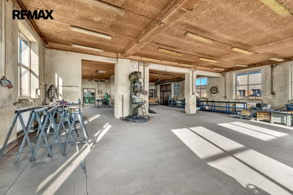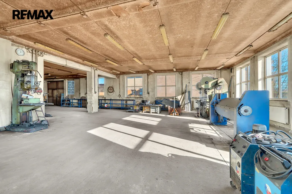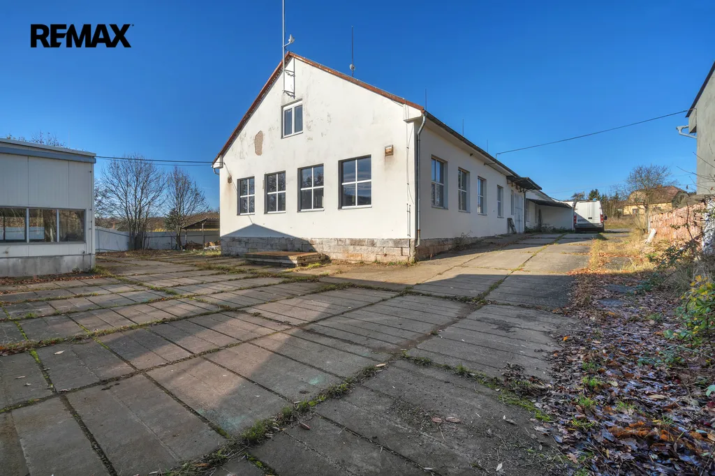 Jedná se o zděný udržovaný dvoupodlažní komplex hlavní budovy 894m2 (částečně podsklepeno cca 30m2), kde budova nabídne dvě kanceláře, zázemí pro zaměstnance – šatny, wc, umývárny a denní místnost, dále již navazují tři dílny/sklady o velikosti cca 310m2. Podlahy jsou betonové a připravené i na manipulaci s vysokozdvižným vozíkem. Hlavní vjezdová vrata o velikosti 3x2,5m. Možno rozšířit o skladování lehčích materiálů v 2. nadzemním patře (půdním prostoru) o velikosti cca 400m2.