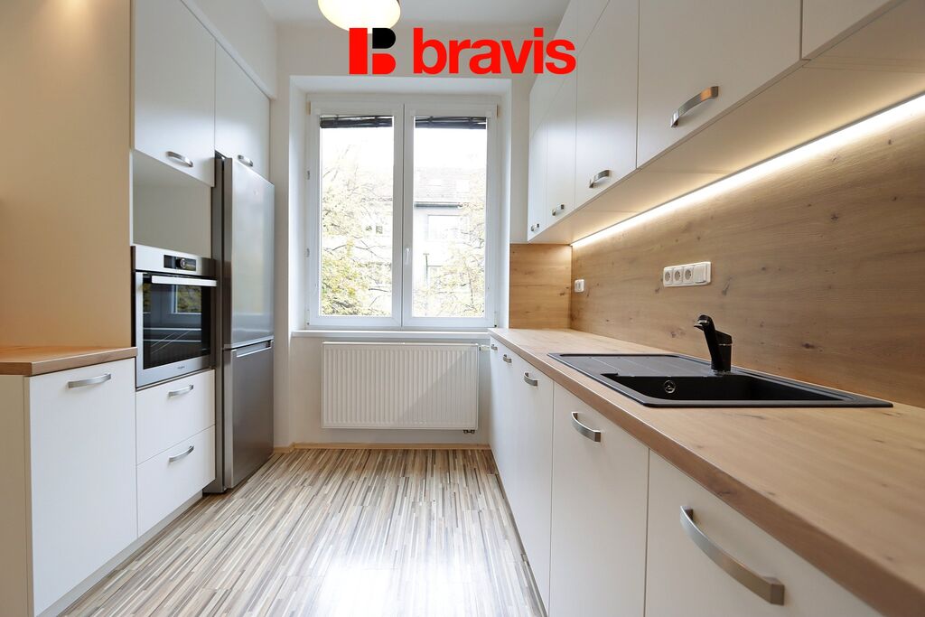 Kuchyně prošla rekonstrukcí a je vybavena novou kuchyňskou linkou s vestavěnými spotřebiči, mezi které patří lednice s mrazícím boxem, trouba, indukční deska, myčka a granitový dřez. Celá linka poskytuje dostatek úložného prostoru a je elegantně podsvícená.