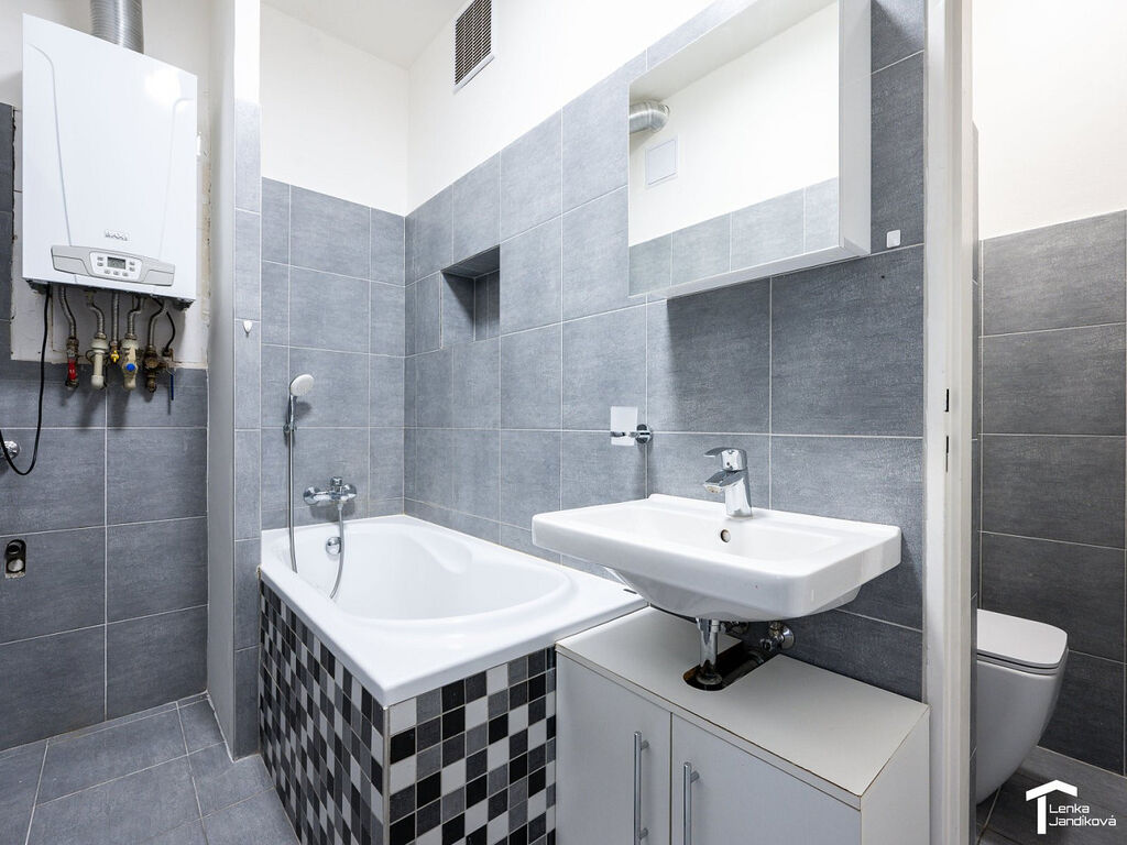 Byt o celkové výměře 90m² vás uchvátí svým vzdušným prostorem díky vyšším stropům. Obývací pokoj je spojený s kuchyňským koutem a dále z něj vejdeme do koupelny. Ta je osazena vanou a je spojená s WC.