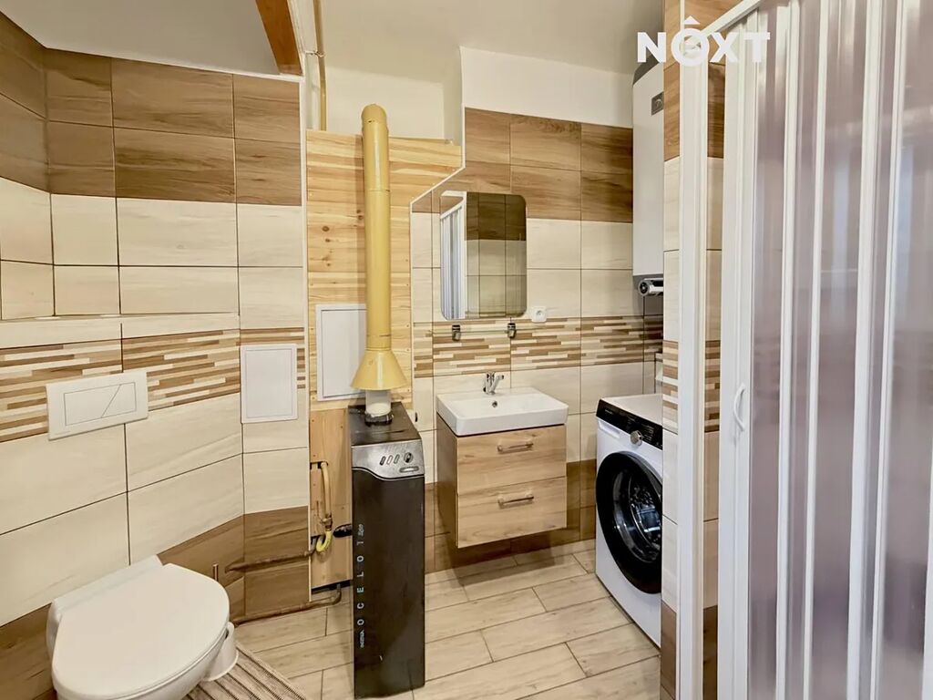 V prostorné vstupní chodbě se vlevo nachází koupelna se sprchovým koutem a toaletou, ohřev vody a vytápění zajišťuje plynový kotel.