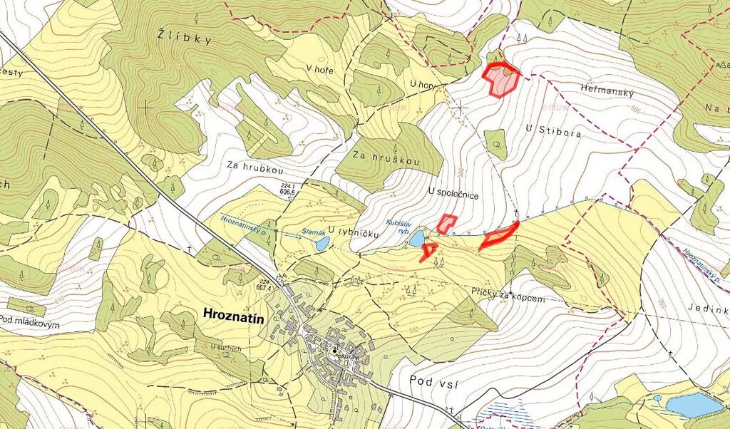 Nabízíme k prodeji zemědělské a související pozemky ve výlučném vlastnictví v katastrálním území Hroznatín, okres Třebíč. Pozemky jsou zapsány na listu vlastnictví č. 411 a jejich celková výměra činí 13 691 m².