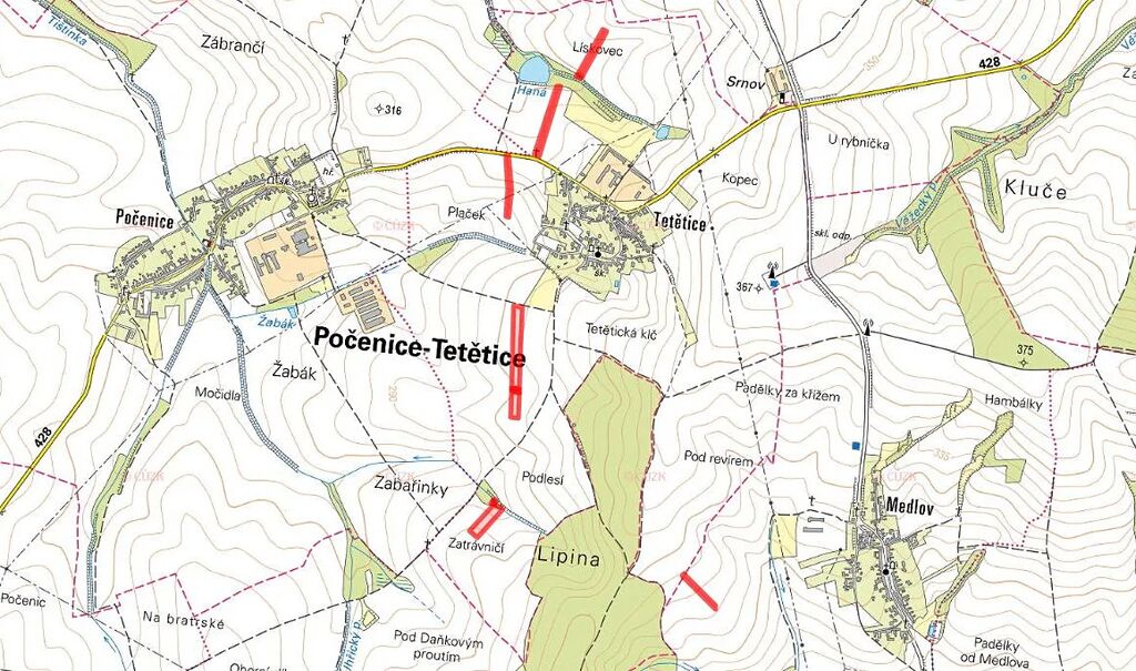 V katastrálních územích Tetětice a Medlov u Zborovic, okres Kroměříž, nabízíme k prodeji soubor 11 pozemků ve výlučném vlastnictví o celkové výměře 37 733 m², z toho 37 262 m² zemědělsky využitelných ploch.