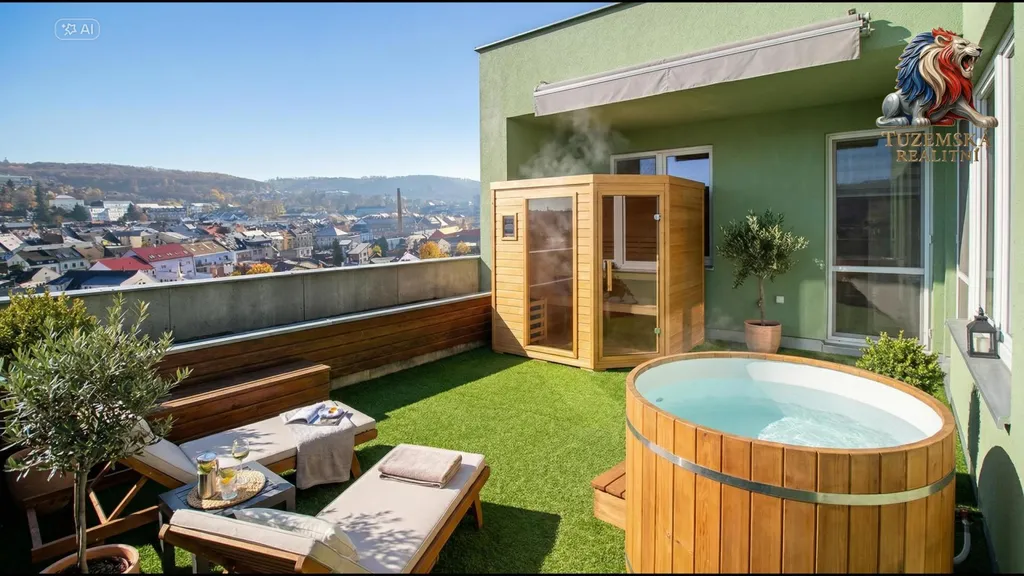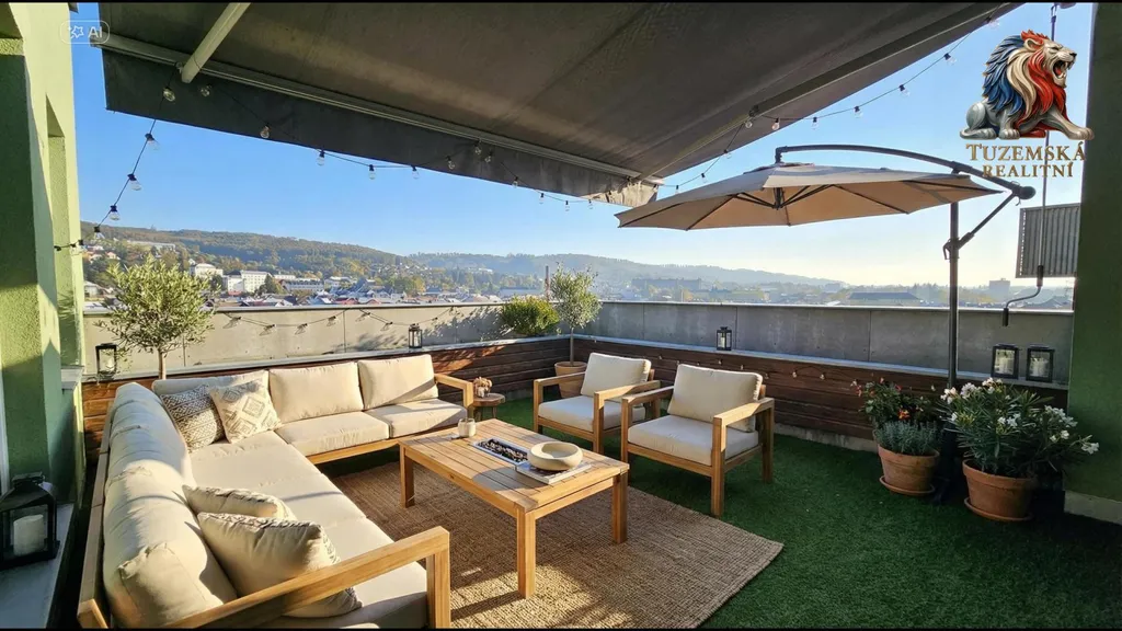 Velká terasa 30m2 s úžasným výhledem je opravdu středobodem bydlení v tomto výjimečném bytě. I Vaše první kroky při osobní prohlídce povedou jistě sem. Troje francouzská okna a to z obýváku, kuchyně a ložnice Vás na ni prostě stále zvou.