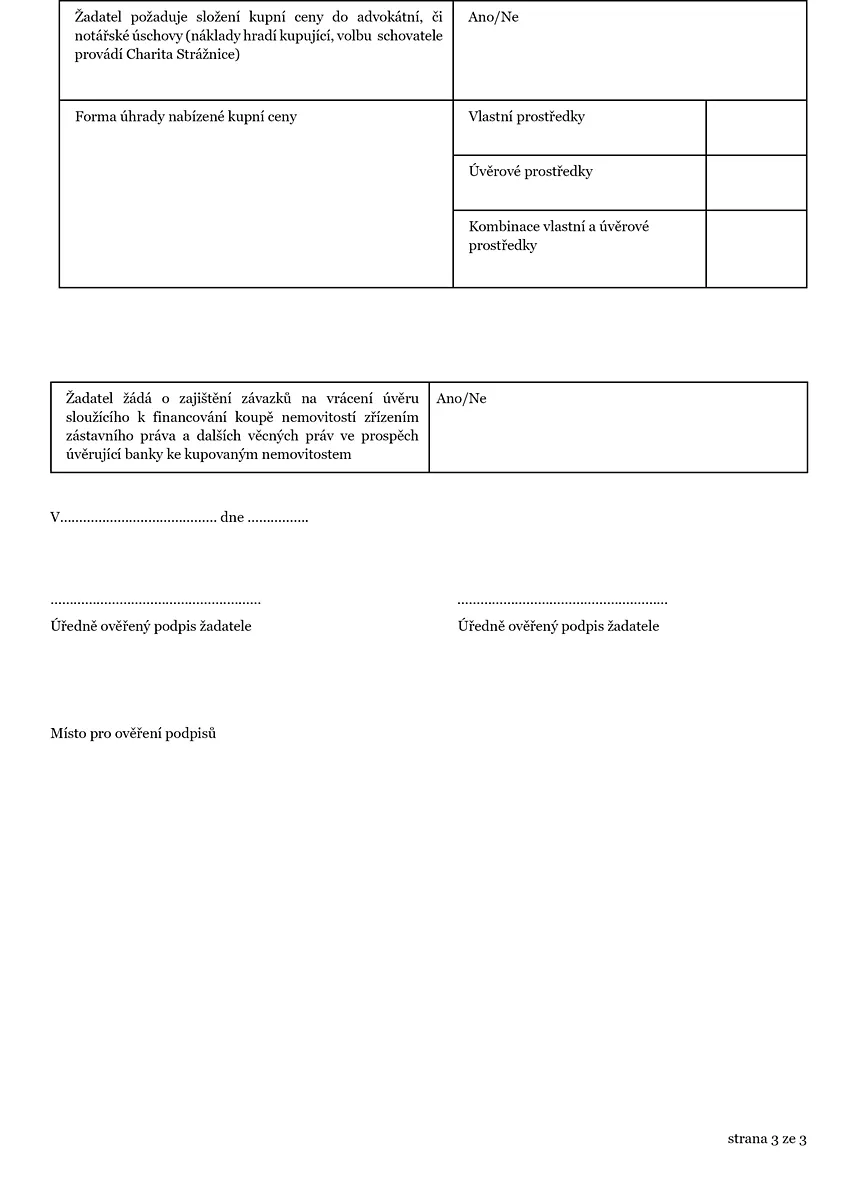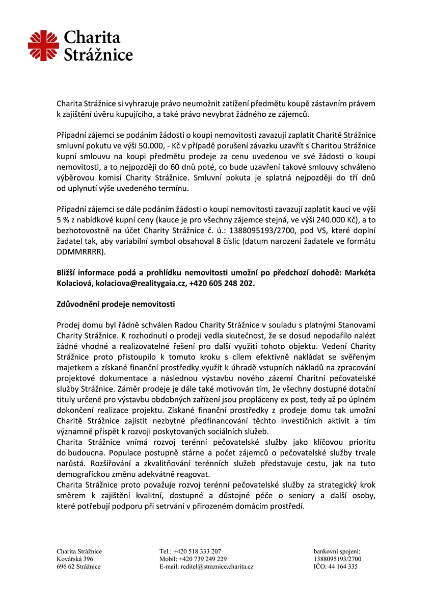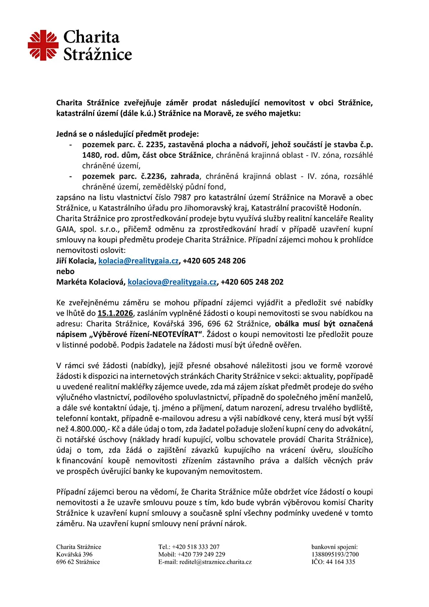 Minimální požadovaná kupní cena byla stanovena na částku ve výši 4.800.000,--Kč. Nabídky na odkoupení mohou případní zájemci podávat nejpozději do 15. 1. 2026, přičemž podáním nabídky se zájemce současně zavazuje ke složení kauce ve výši 240.000,--Kč na účet Charity Strážnice. Bližší informace jsou zveřejněny v přiloženém záměru prodeje. Žádost o koupi tvoří přílohu zveřejněné dokumentace. Vlastník nabízených nemovitostí si vyhrazuje právo neuzavřít smlouvu s žádným zájemcem.