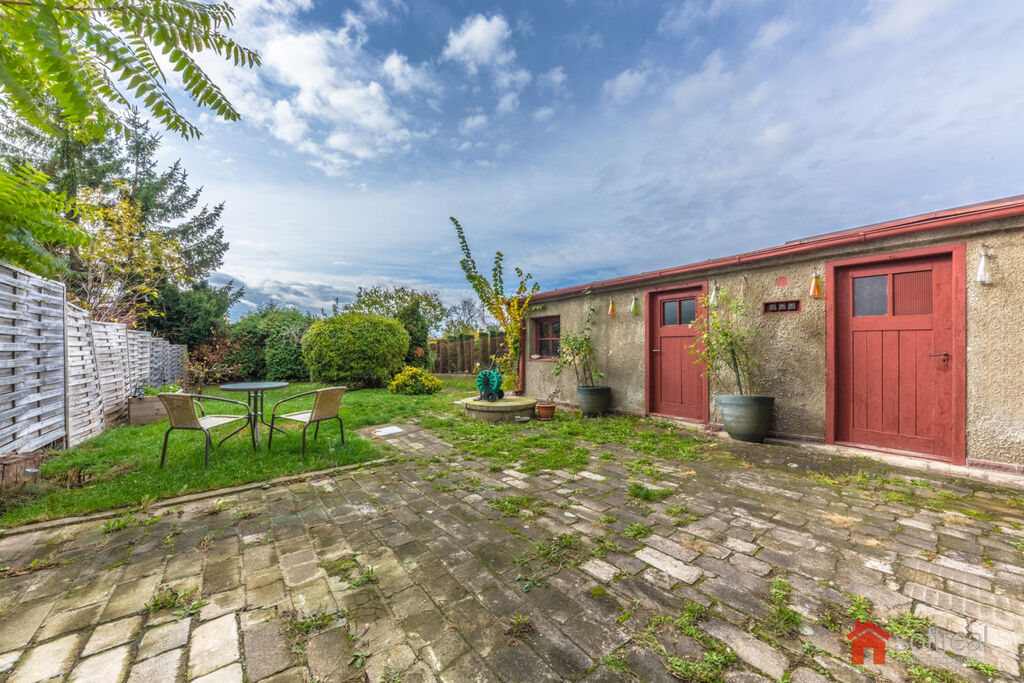 Stavbu odděluje od ulice menší předzahrádka, součástí oplocené zahrady za domem je garáž spojená s dílnou, kopaná studna a vjezd z ulice z domem.