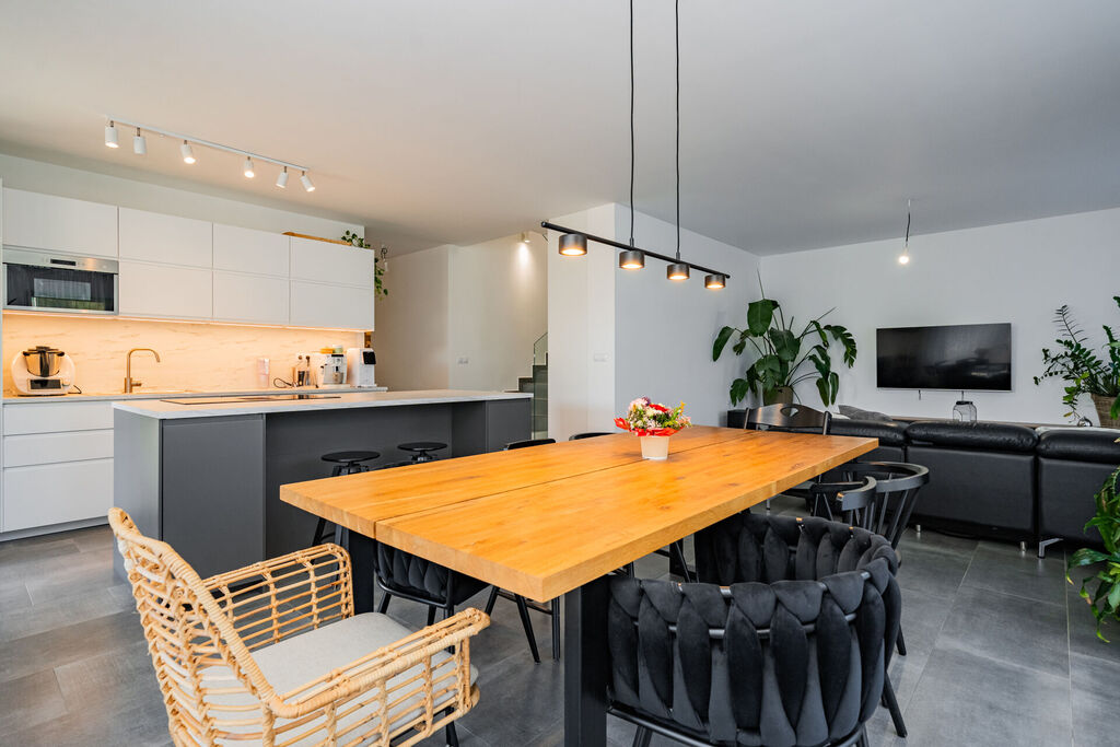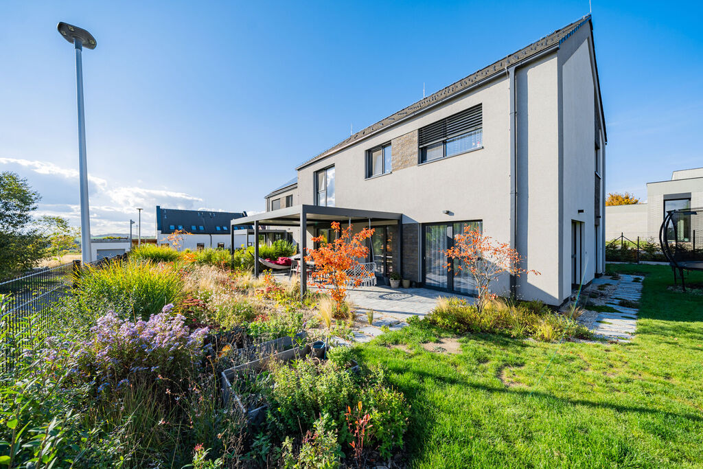 V přízemí Vás okouzlí velkorysý obytný prostor se vstupem na terasu s pergolou a do dále do zahrady, který moderně propojuje obývací pokoj, jídelnu a kuchyni s pracovním ostrůvkem. Kuchyně je vybavena kvalitní kuchyňskou linkou se spotřebiči. Pečlivě udržovaná zahrada je chloubou této nemovitosti, zatravněná se vzrostlými rostlinami, kde je patrný dotek umu paní majitelky a její excelentní cit pro promyšlenou kompozici a vkusné propojení barev i jednotlivých druhů rostlin. Samozřejmostí je také praktické využití části zahrady jako zázemí pro děti a zastřešená pergola poskytuje reálné zvětšení obytného prostoru, jelikož jste chráněni nejen před sluncem, ale i před deštěm. V přízemí domu se dále nachází samostatný pokoj, sloužící jako pracovna či návštěvní pokoj, vstupní chodba s vestavnými skříněmi, technická místnost a menší koupelna s toaletou. Z hlavního obytného prostoru je vstup schodištěm prvního patra. Celkově jsou zde tři pokoje. Dva pokoje pro děti se samostatnou koupelnou s toaletou. Pomyslnou třešničkou na dortu je oddělené zázemí hlavní ložnice, která je nejen prostorná a světlá, ale zejména úžasně řešená s šatnou a další koupelnou s toaletou pro zachování maximálního soukromí.