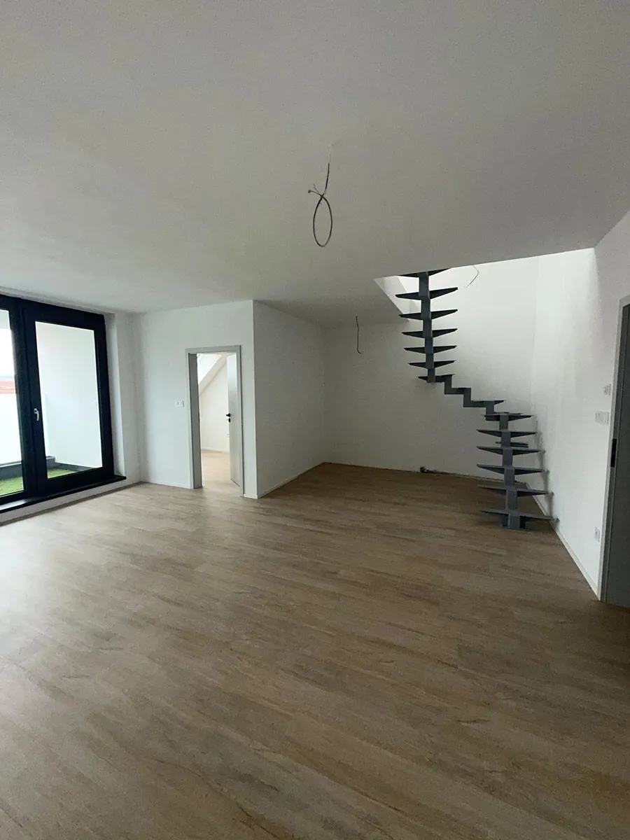 Dispozice bytu zahrnuje vstupní chodbu, tři samostatné pokoje, prostorný obývací pokoj s kuchyňským koutem, dvě koupelny a vnitřní schodiště. K bytu náleží také tři terasy o velikostech 6,12 m², 14,10 m² a 8,40 m², které poskytují příjemný prostor pro relaxaci či posezení na čerstvém vzduchu. Součástí je rovněž samostatný sklep o velikosti 3 m² umístěný v přízemí domu a dvě parkovací stání.