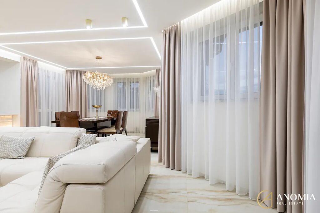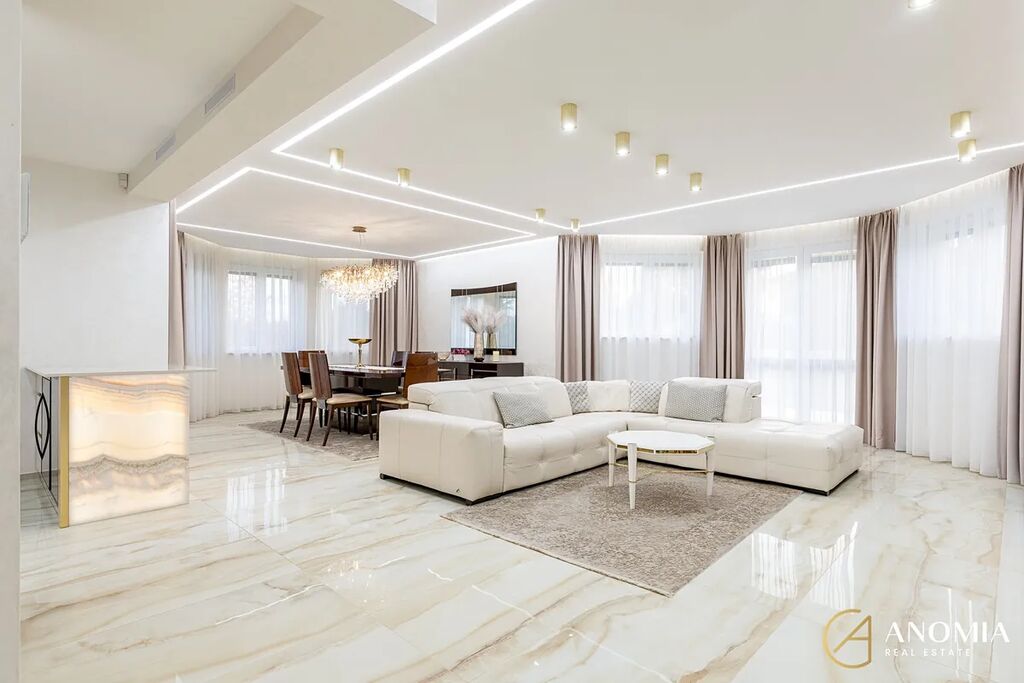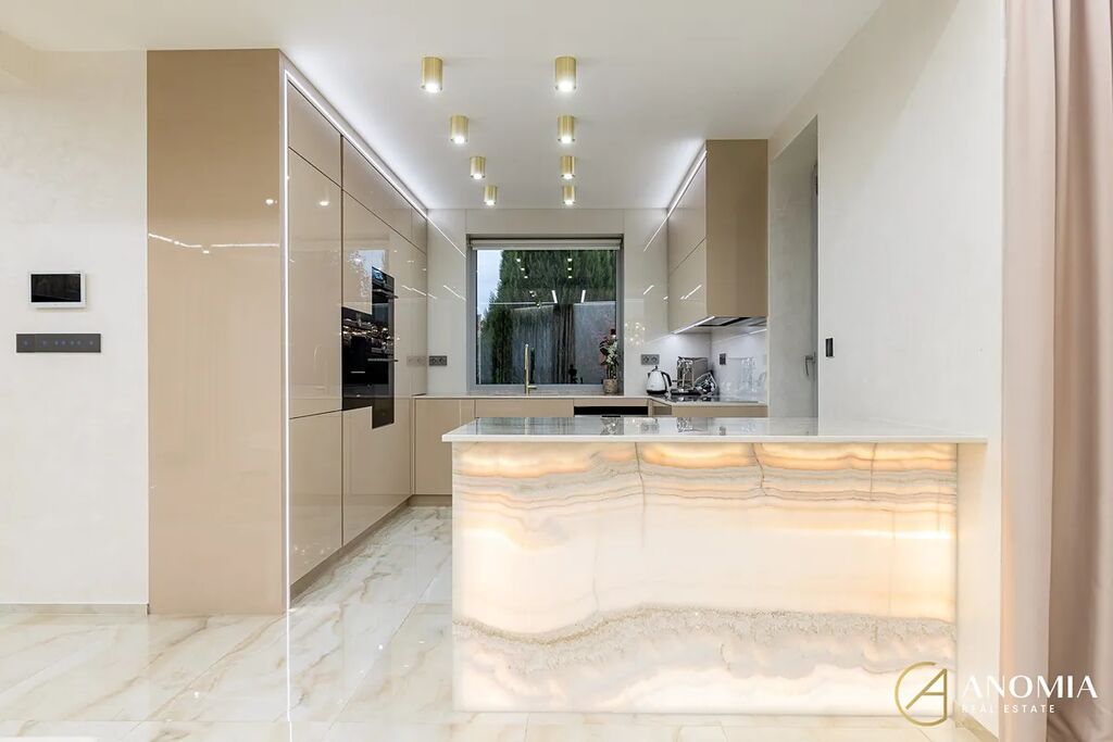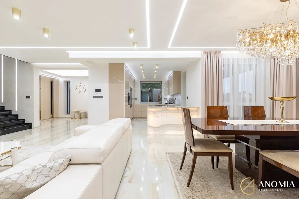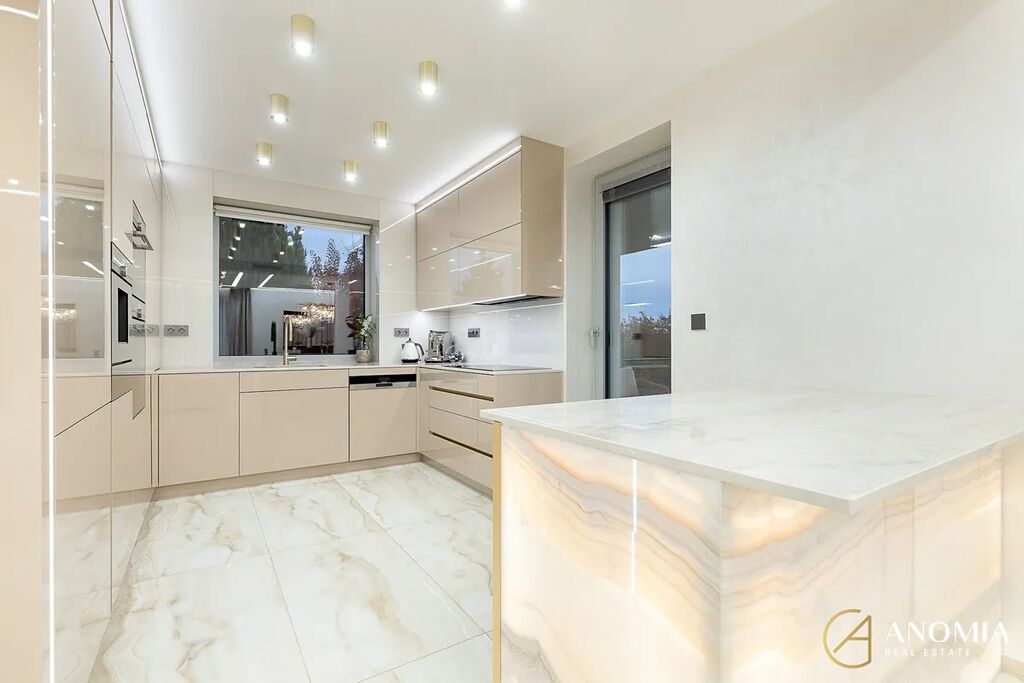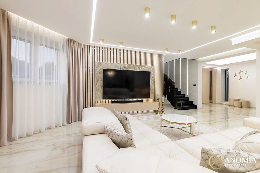 Už při vstupu zaujme svou prostornou halou s vestavěnými úložnými prvky na míru. Z haly plynule vstoupíte do otevřeného obytného prostoru, který propojuje obývací část, designovou jídelnu a luxusní kuchyni. Ta byla vyrobena na zakázku firmou Vagunda a je vybavena spotřebiči Siemens. Dominantou celého prostoru je onyxový ostrůvek s podsvícením a vestavěnou vinotékou. Z kuchyně je přímý vstup na zastřešenou terasu s výhledem do zeleně.