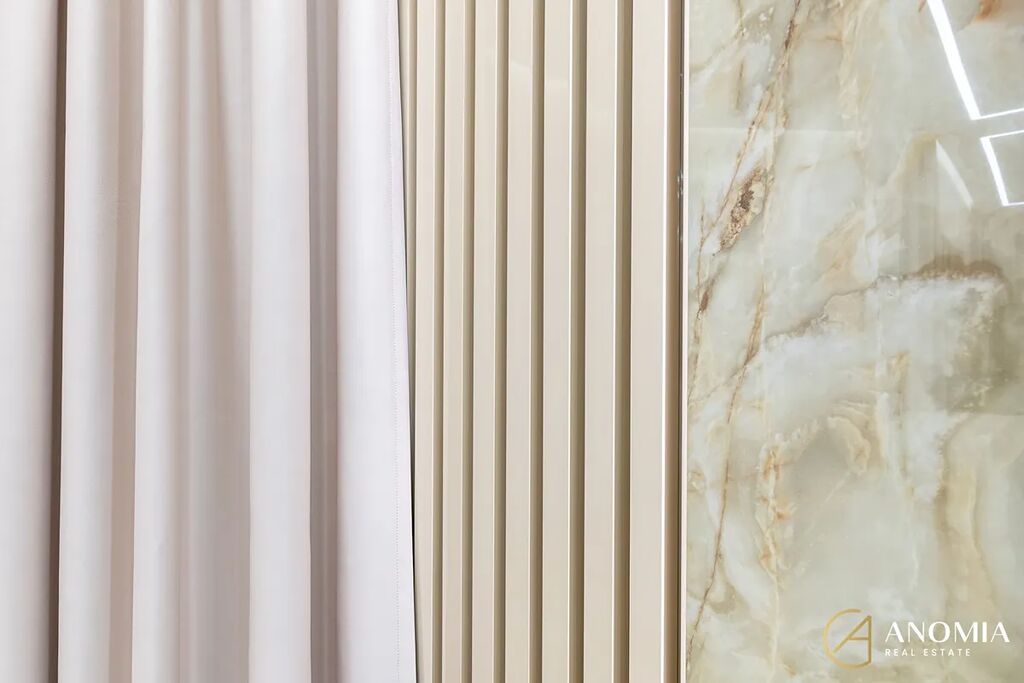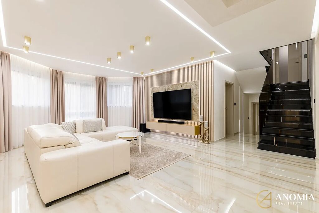 Stěny obývací části i vstupní haly jsou provedeny dekorační technikou benátský štuk, který společně s velkoformátovými obklady a dřevěnými prvky podtrhuje nadčasový charakter interiéru. V přízemí se dále nachází dětský pokoj, koupelna se sprchovým koutem a toaletou, technická místnost s plynovým kotlem, které slouží jako také jako prádelna a garáž s parkováním pro dvě vozidla.