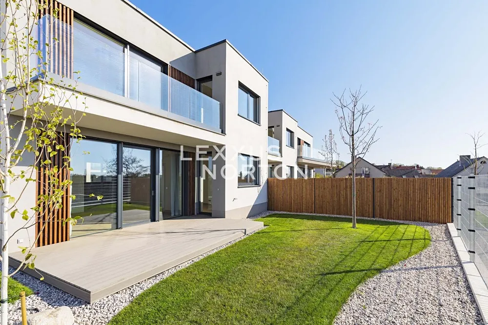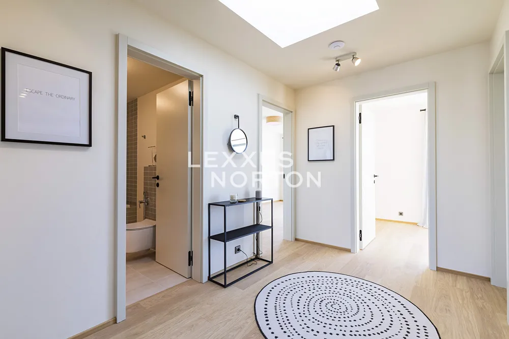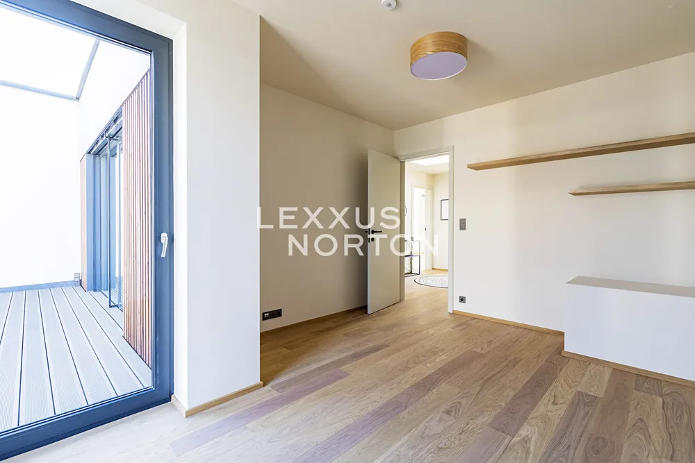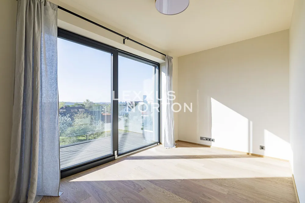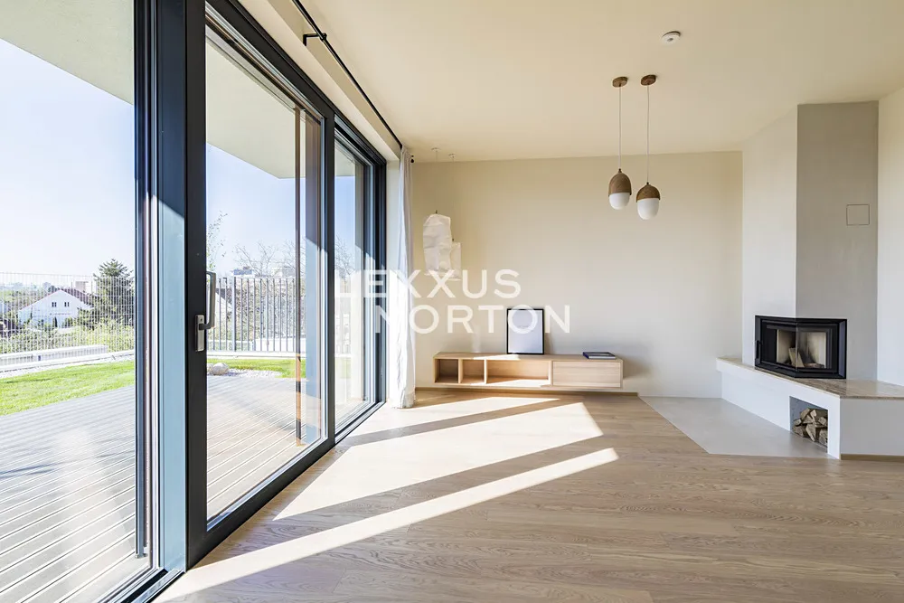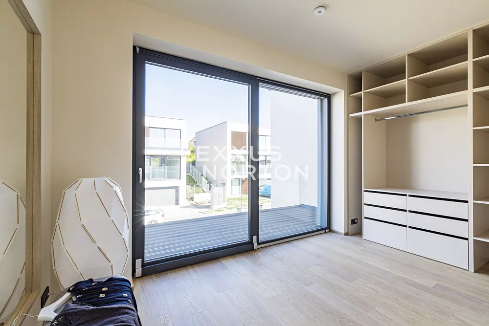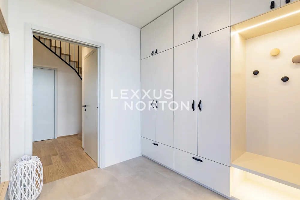 Dům je také vybaven chytrým systémem Loxone, solárními panely, dobíjecí stanicí pro elektro automobil a na zahradě je venkovní domek se zelenou střechou.