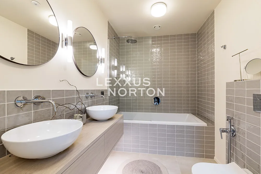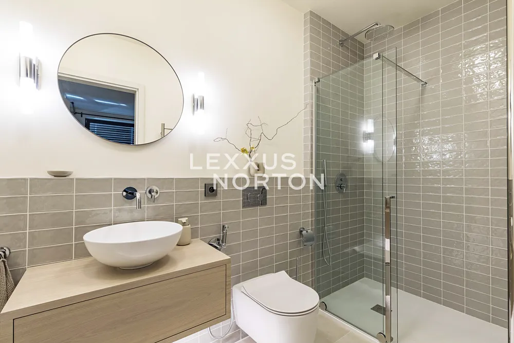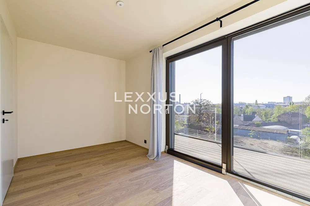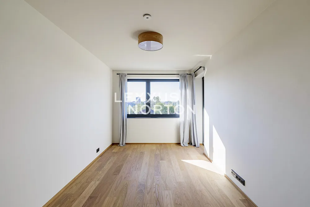 Interiér tvoří vstupní chodba, obývací pokoj s kuchyňským koutem, ložnice s přístupy na terasu, 2 koupelny (vana, sprchový kout, bidet a toaleta), šatna a 2 komory. K domu náleží 3 parkovací místa před domem.