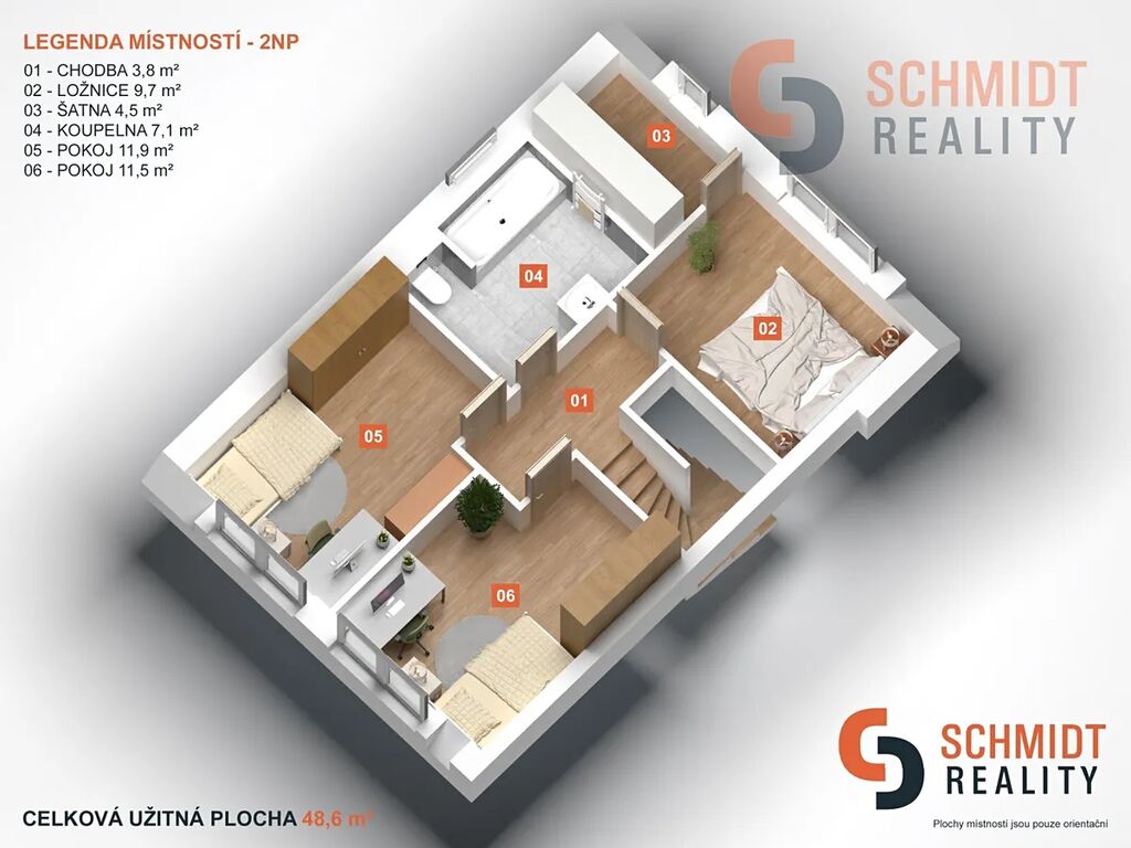 V patře se nachází tři samostatné pokoje, šatna a druhá koupelna s WC. Dispozice tak přirozeně odděluje denní a noční část domu a nabízí dostatek soukromí i prostoru pro rodinný život.