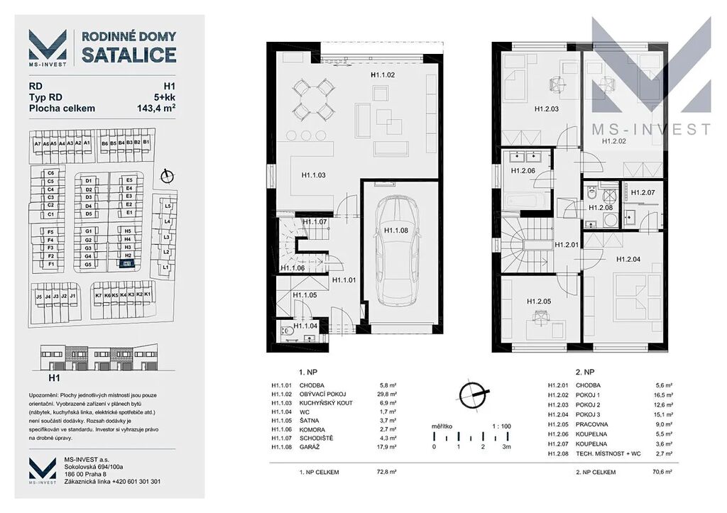 V rámci developerského projektu Rodinné domy Satalice se v nově vzniklé ulici Hubačova nachází nabízený krajní dům H-1 velikosti 5+kk a celkové ploše 144 m2 s větším pozemkem o ploše 271 m2. Tento dům disponuje v 1. NP vlastní garáží, šatnou, komorou, toaletou, prostorným obývací pokojem s kuchyňským koutem o ploše 37 m2 a navazující terasou propojující dům se zahradou. Ve 2. NP se nachází hlavní ložnice o ploše 17 m2, včetně samostatné koupelny se sprchovým koutem a vstupem přímo z ložnice, dále další dvě ložnice, pracovna, další koupelna s vanou a dvěma umyvadly a samostatné WC spojené s technickou místností. Zahrada je orientována na západ. Kromě vlastní garáže je možné parkovat další auto na vlastním pozemku před domem. V ceně domu je mimo jiné fotovoltaika s bateriovým úložištěm a napojením do distribuční soustavy a dálkově ovládané hliníkové předokenní žaluzie na všech oknech. V rámci developerského projektu Rodinné domy Satalice vznikne celkem 48 řadových rodinných domů provedených ve třech variantách s dispozicemi 4+kk až 5+kk, užitnou plochou od 127 m2 až 160 m2. Pozemky s výměrou až 363 m2 nabídnou dostatek prostoru pro celou rodinu.