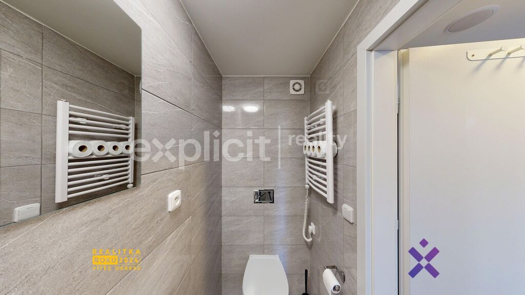 Moderní a čistá koupelna se sprchovým koutem je společně s toaletou sloučena dohromady. Součástí koupelny je i topný žebřík.