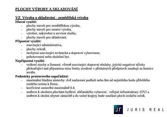 Pozemek je dle územního plánu umístěn v ploše VZ - Výroba a skladování - zemědělská výroba. Je zde tedy možné umístit stavby pro zemědělskou výrobu, stavby pro výrobní, nevýrobní i servisní služby, stavby určené pro skladování a mnohé další.
