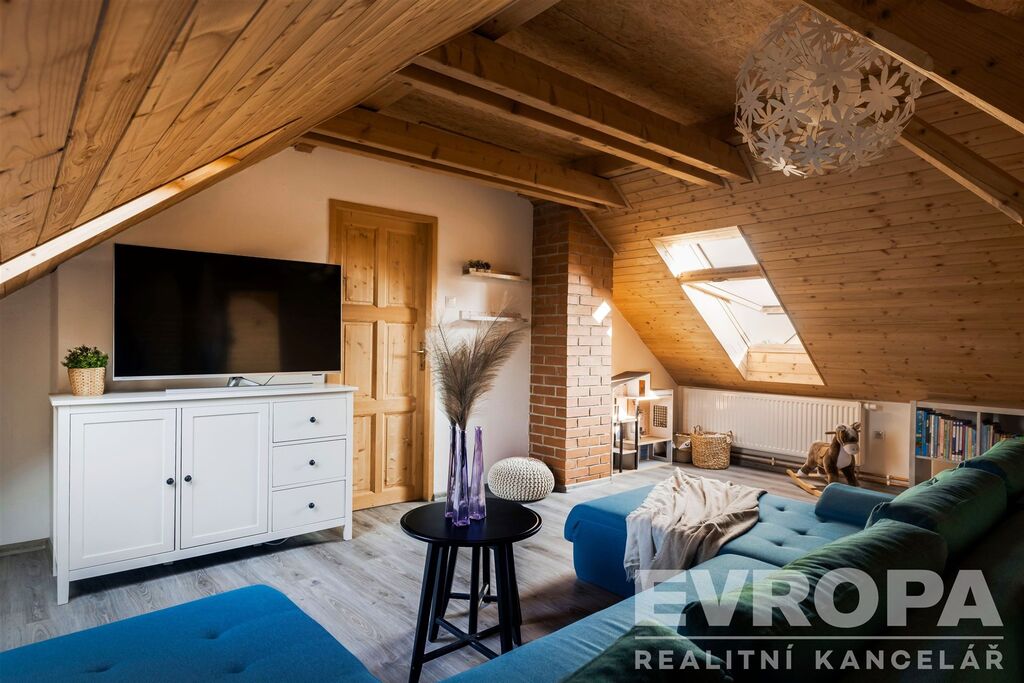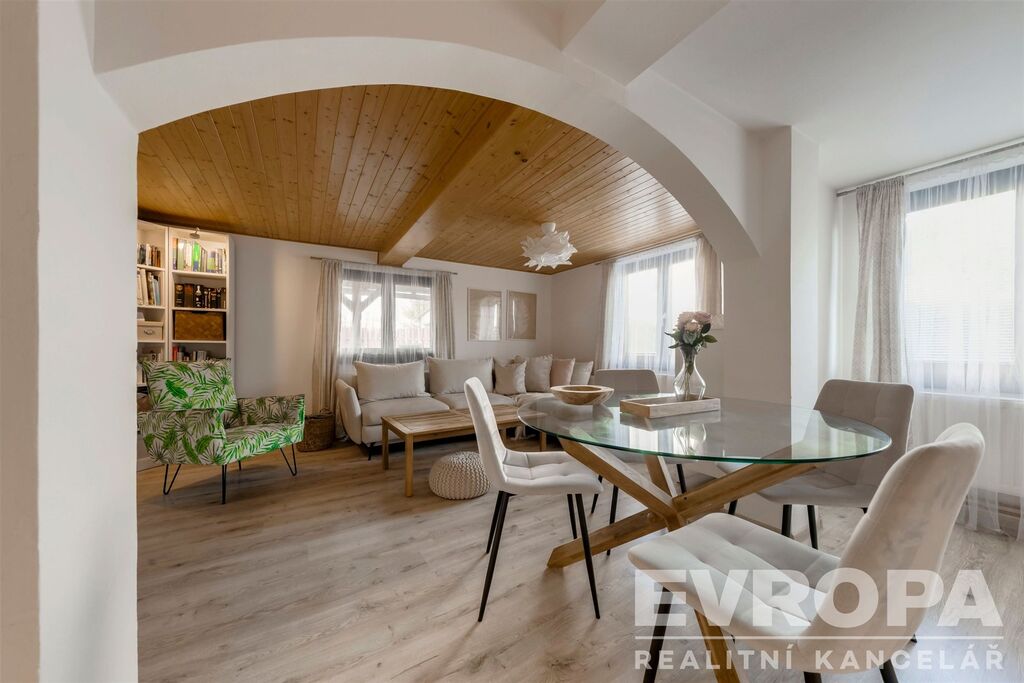 Interiér je dokonalým propojením dřeva, doplněné o designovou dlažbu, luxusní spotřebiče a hlavně je zde na každém kroku cítit otisk vkusného a praktického využití každého koutu.