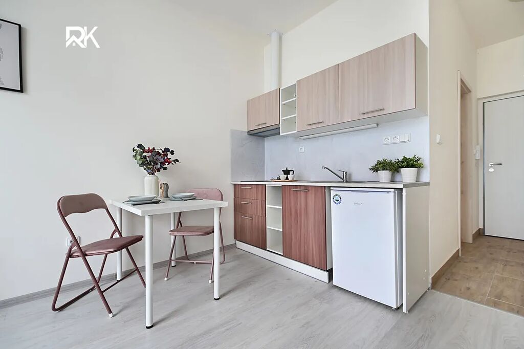 Dispozici bytu tvoří světlý obývací pokoj s kuchyňským koutem a koupelna s toaletou. K jednotce náleží také praktická sklepní kóje o velikosti 2 m², umístěná na stejném patře – což je velkou výhodou pro snadný přístup a uskladnění věcí.