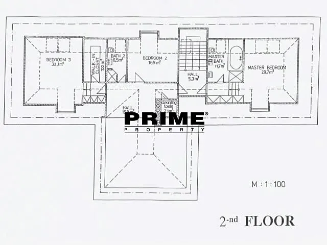 Dům je třípodlažní (suterén, přízemí a podkroví). Dispozice přízemí domu: vstupní hala, velký obývací pokoj (61m2) s krbem, jídelní částí a vstupem na zahradu, plně vybavená nová kuchyň s kuchyňskou linkou a spotřebiči (sklokeramická varná deska, trouba, myčka, lednice s mrazákem, mikrovlnná trouba a pračka), ložnice pro hosty, pracovna či ložnice, koupelna a samostatné WC. 1. patro: hlavní ložnice s vlastní koupelnou, další dvě ložnice, další koupelna, šatna a komora. Suterén: velká místnost (39m2) (vhodná k využití jako party/TV místnost nebo herna, posilovna či skladová místnost), vinný sklípek a prádelna.