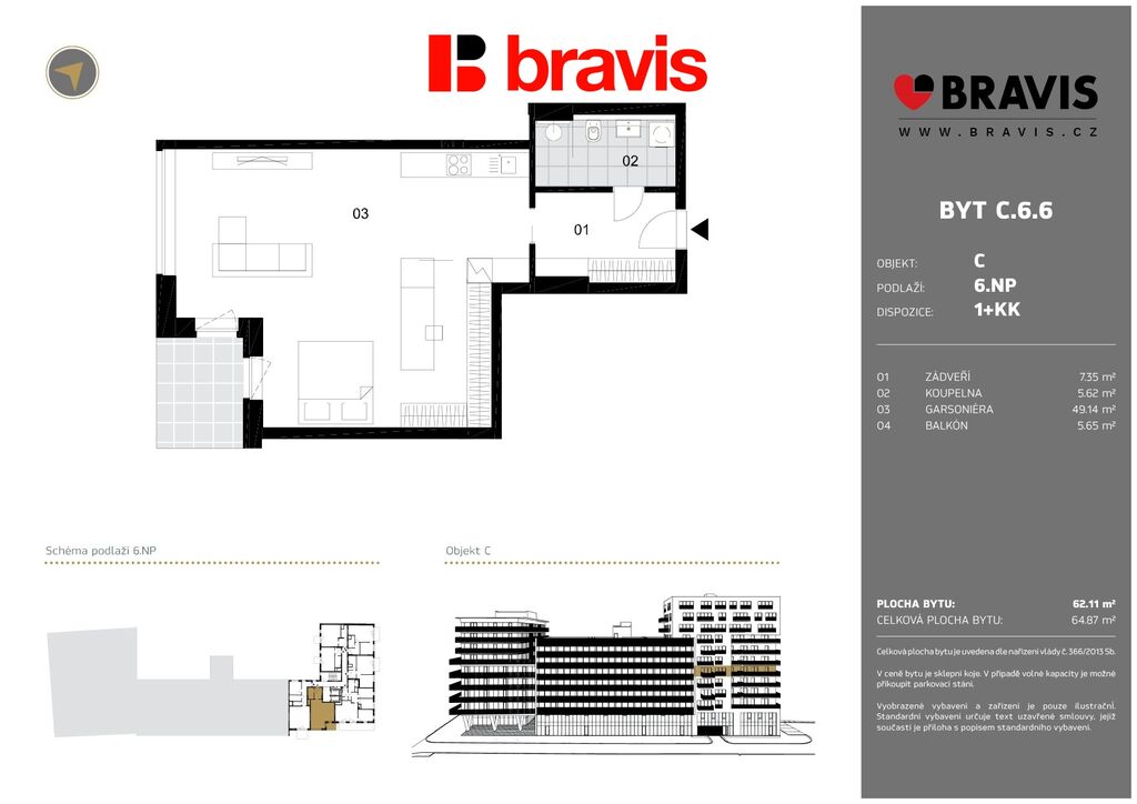 Byt 2+kk o celkové podlahové ploše 65 m2 + balkón 6 m2 a sklepem se nachází ve 6. NP.