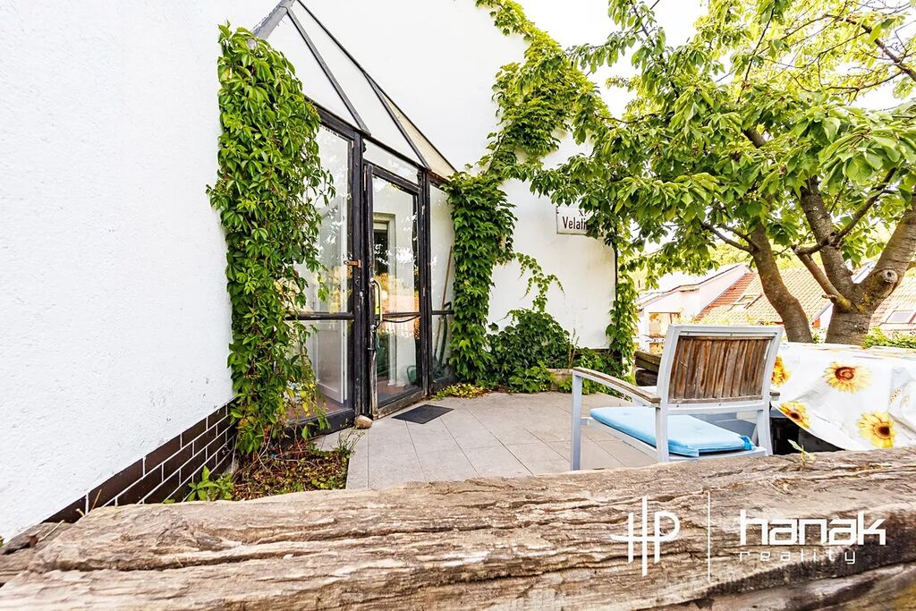 Venkovní terasa nabízí příjemné posezení s výhledem do zeleně. Zahrada je menší, o výměře cca 60 m², a je přístupná pouze z terasy před vstupem do domu.