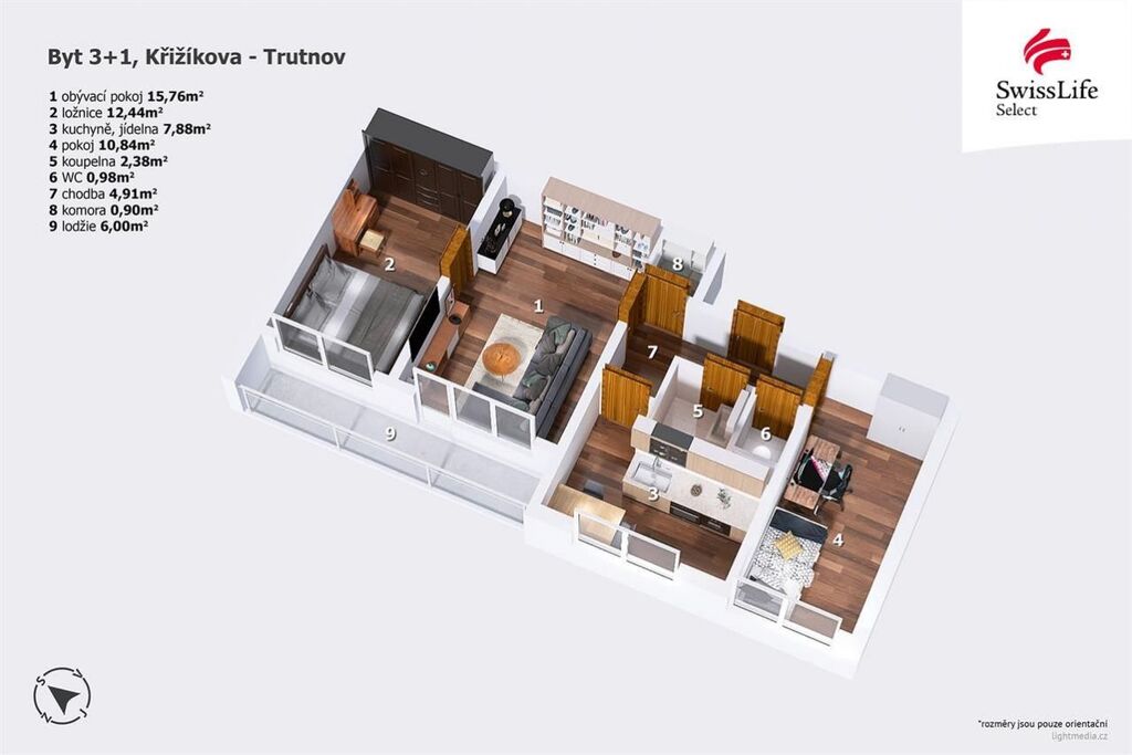 2 neprůchozí ložnice, obývací pokoj s balkonem, kuchyň, koupelnu s vanou + samostatné WC a malou technickou místnost přímo. v bytě. K dispozici máte sklep s výměrou 1 m2 a svá kola, kočárky apod. si pohodlně uložíte ve společných částech domu (kolárna/kočárkárna).