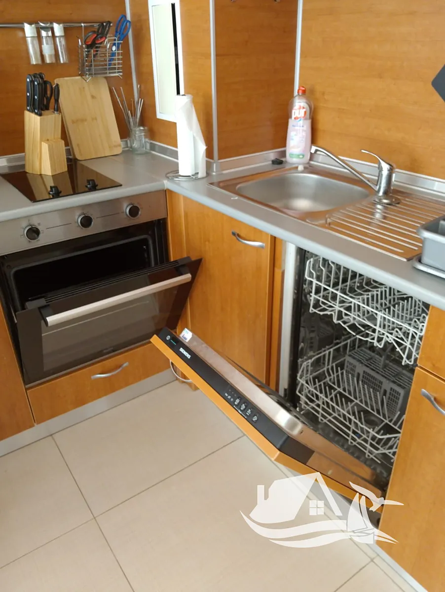 Byt je kompletně vybaven nábytkem i spotřebiči – kuchyně je zařízena vestavěnými skříňkami, troubou, varnou deskou, digestoří a lednicí. Interiér působí útulně a moderně, ideální pro trvalé bydlení i rekreační pobyty.