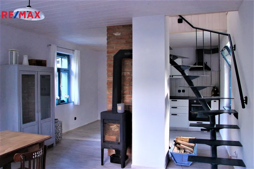 Topení: krbová kamna + podlahové topení (přízemí), el. přímotopy (patro)