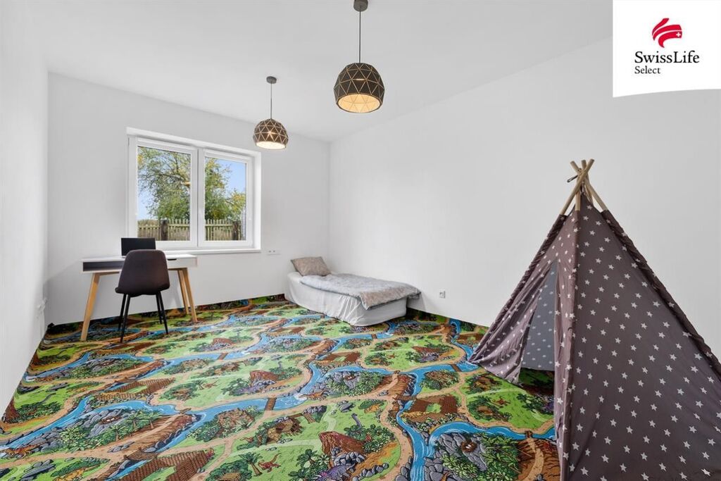 V domě se nachází prostorný obývací pokoj s kuchyňským koutem a přípravou pro krbová kamna nebo zděný krb, dále jedna z koupelen s hydromasážní vanou, sprchovým koutem a toaletou. Druhá koupelna se sprchovým koutem a WC a dostatek prostoru pro ložnice, dětské pokoje, pracovnu a posilovnu.