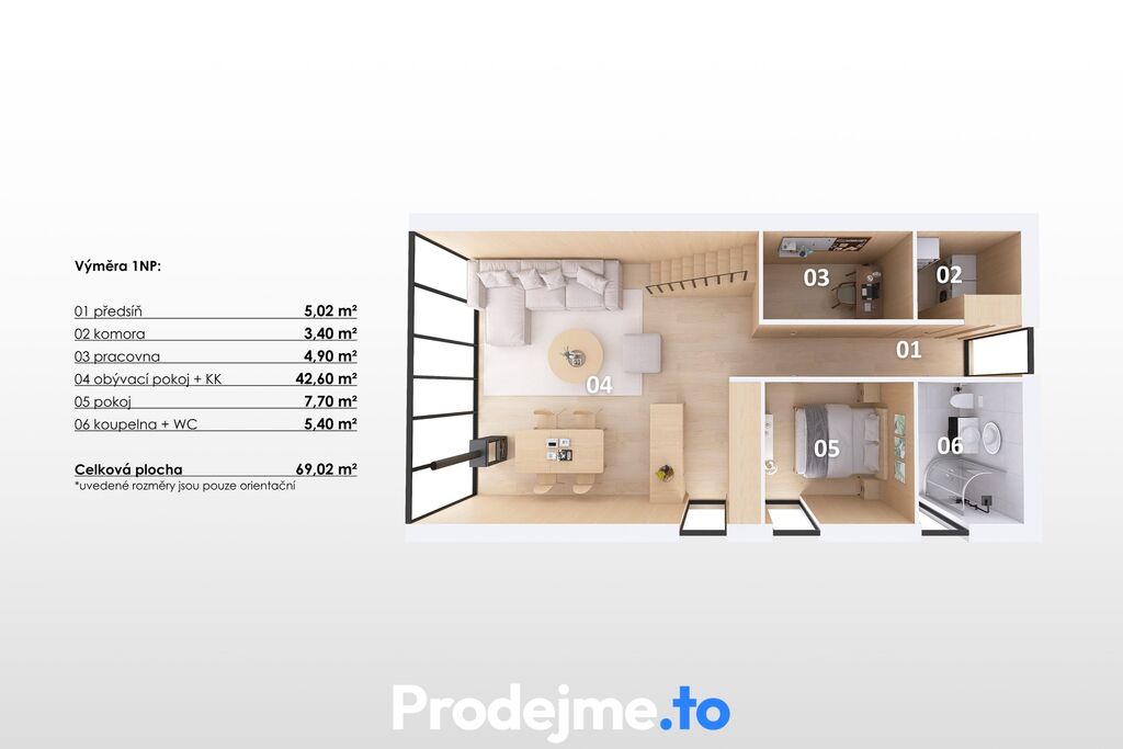 V patře o ploše 28 m2 je druhá ložnice, koupelna s vanou a toaletou a galerie využitelná k relaxaci nebo jako úložný prostor. Součástí patra je také volné místo, které lze v případě zájmu využít pro menší pokoj – dům tak může mít dispozici až 4+kk.