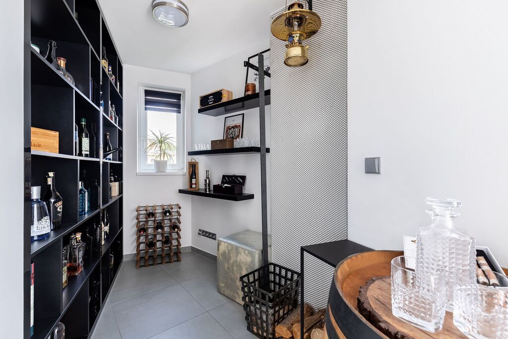 - technická místnost, do které je vchod skrytě vedle lednice - zde je veškeré technické zázemí, kondenzační kotel BAXI, dále pračka/sušička AEG, filtrace - změkčovač vody.