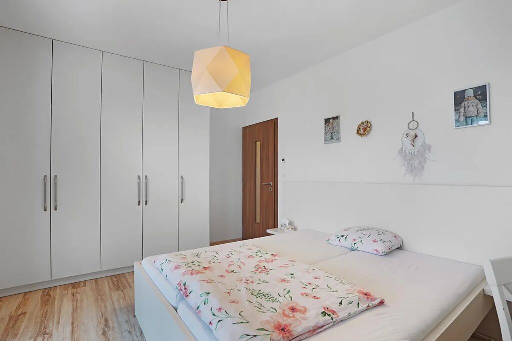 Ložnice je orientována do zahrady a je vybavena vestavěnými skříněmi na míru.