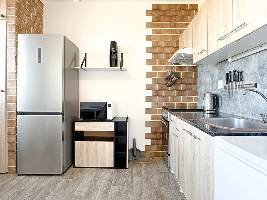 Byt disponuje ložnicí s manželskou postelí a komodou, obývacím pokojem se sedačkou, konferenčním stolkem a psacím stolem. Kuchyně je plně vybavena všemi potřebnými spotřebiči. Chodba je prakticky řešena a nabízí prostornou šatnu. Koupelna je v původním stavu a je vybavena sprchovým koutem a WC.