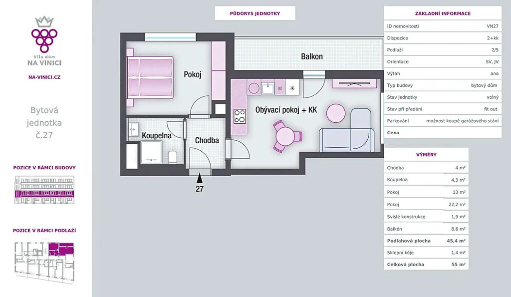 Byt se nachází ve 2. patře (3.NP) domu s výtahem a bezbariérovým přístupem, což zajišťuje pohodlné užívání pro každého. K bytu (45m²) náleží prostorný balkon o výměře 9 m², orientovaný do klidné vilové čtvrti – ideální místo pro relaxaci s krásným výhledem do zeleně. Dále je k dispozici sklep o velikosti 1,4 m², praktický pro uložení sezónních věcí.