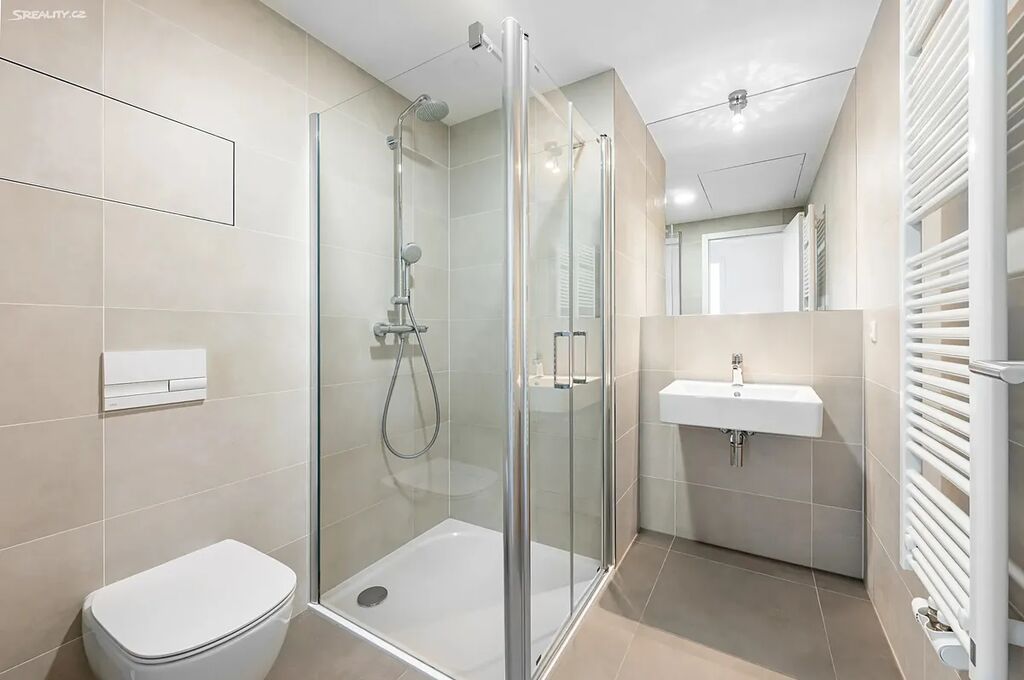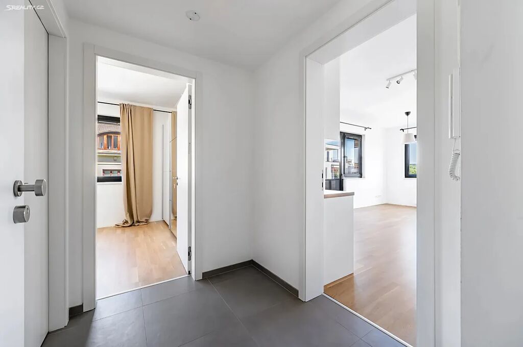 Interiér bytu je vybaven novou kuchyňskou linkou se značkovými spotřebiči (včetně myčky, sklokeramické desky, elektrické trouby, lednice s mrazákem). Prostorná chodba s vestavěnou skříní navazuje na světlou koupelnu zařízenou v moderním stylu.