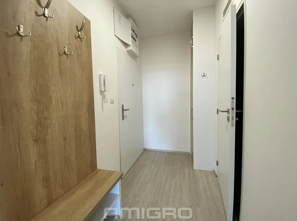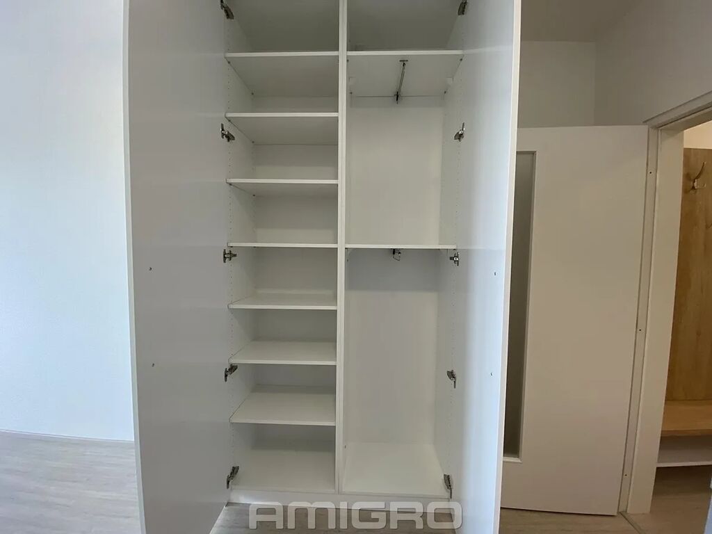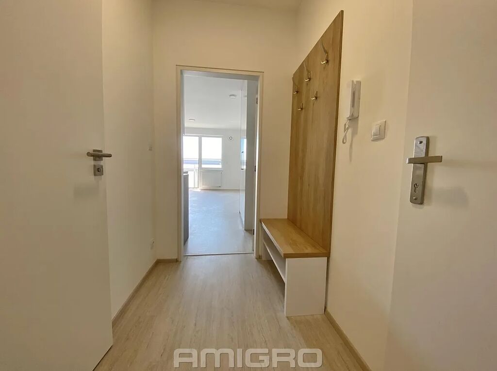 Byt se k pronájmu nabízí zařízený kuchyňskou linkou s lednicí, myčkou nádobí, sklokeramickou varnou deskou, elektrickou troubou a odsavačem par, dále barový pult, vestavná šatní skříň v pokoji, vest. skříň v předsíni a předsíňová stěna.