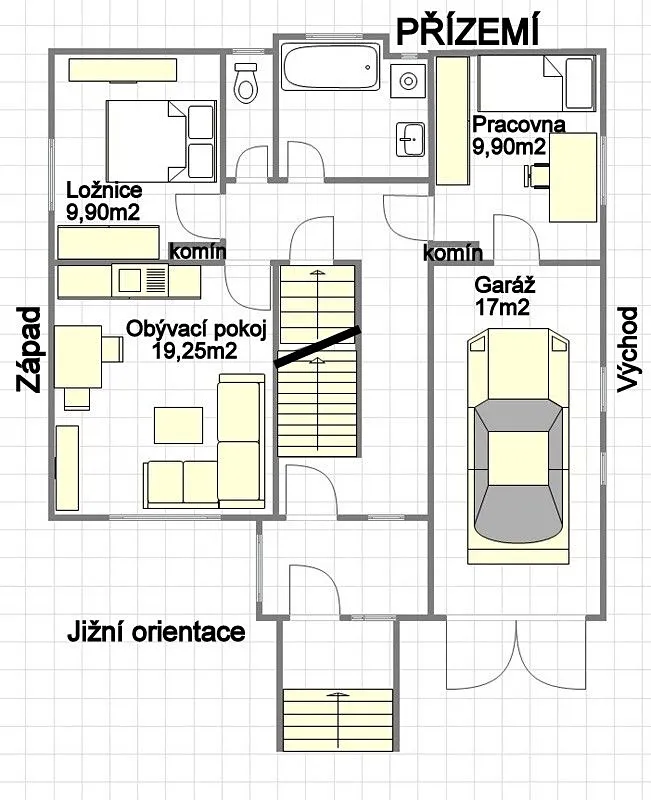 Přízemí: (79 m2) 3+kk, obývací pokoj s kuch. koutem (přivedena voda a elektřina), ložnice a místnost s možností využití jako pracovna, nebo další pokoj, koupelna s vanou a přípojka pro pračku, toaleta zvlášť, garáž, schodiště do patra a do suterénu.
