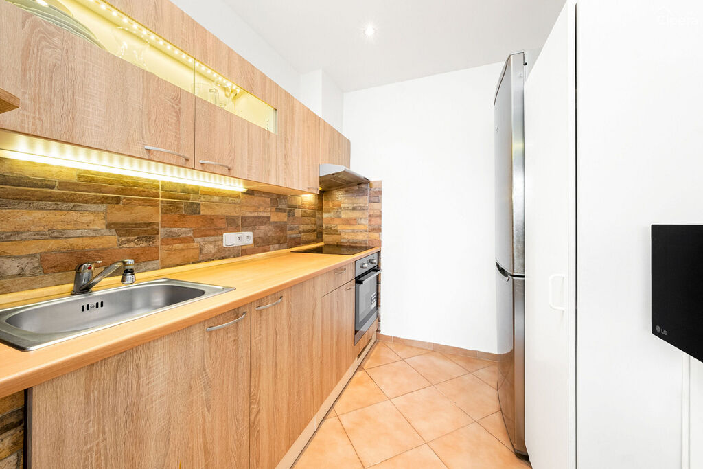 Bytová jednotka s dispozicí 2kk má výměru 43m² a nachází se ve 6. nadzemním podlaží klidného panelového domu s výtahem. Byt sestává z obývacího pokoje s kuchyňským koutem, ze samostatné ložnice, chodby a koupelny s toaletou. V kuchyni se nachází trouba se sklokeramickou varnou deskou a digestoří. V koupelně je k dispozici vana, toaleta a umyvadlo.