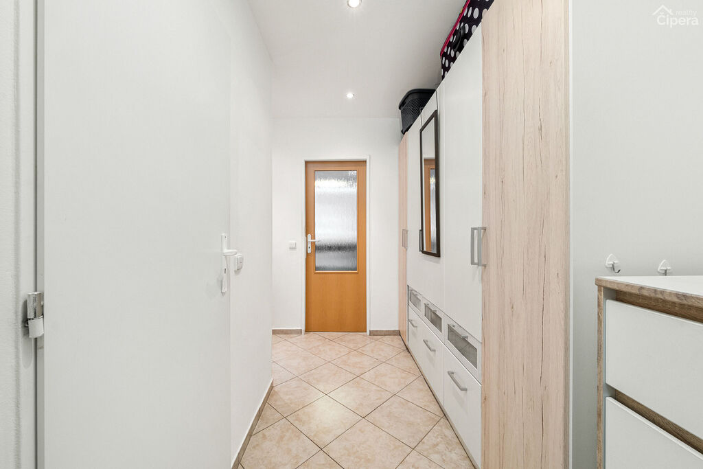 Velikou výhodou této nabídky je prostorná garáž s elektrickými garážovými vraty, která má výměru 16m² a je situovaná v přízemí bytového domu. V garáži můžete bez problému zaparkovat své auto a zároveň Vám tam zbyde i prostor na skladování. Dále je součástí prodeje i samostatný sklep s výměrou 3m².
