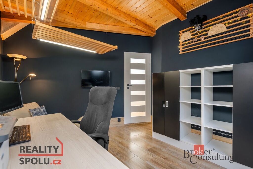 Přímý vjezd, dálkově ovládaná brána, připojení na kanalizaci, obecní i vlastní zdroj vody, internet. Na každém podlaží ovládání topení zvlášť, v koupelně topný žebřík. Fasáda modřín, podlahy vinyl, střešní okna Velux.